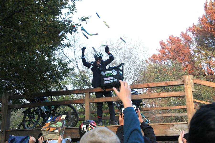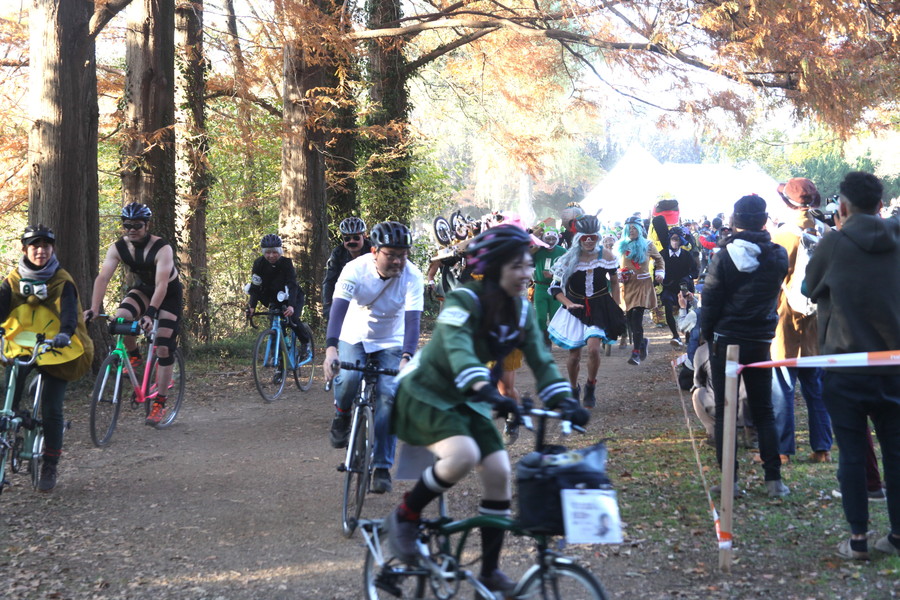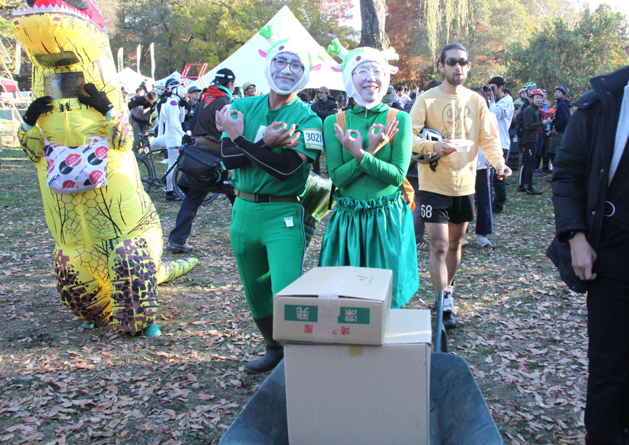 バイクロアのハイライトといえば2日目の最終レース、オウルクラスだ。簡単に言えば何でもありの仮装レース。自転車ではなく、ねこぐるまでネギを運ぶ参加者も。
