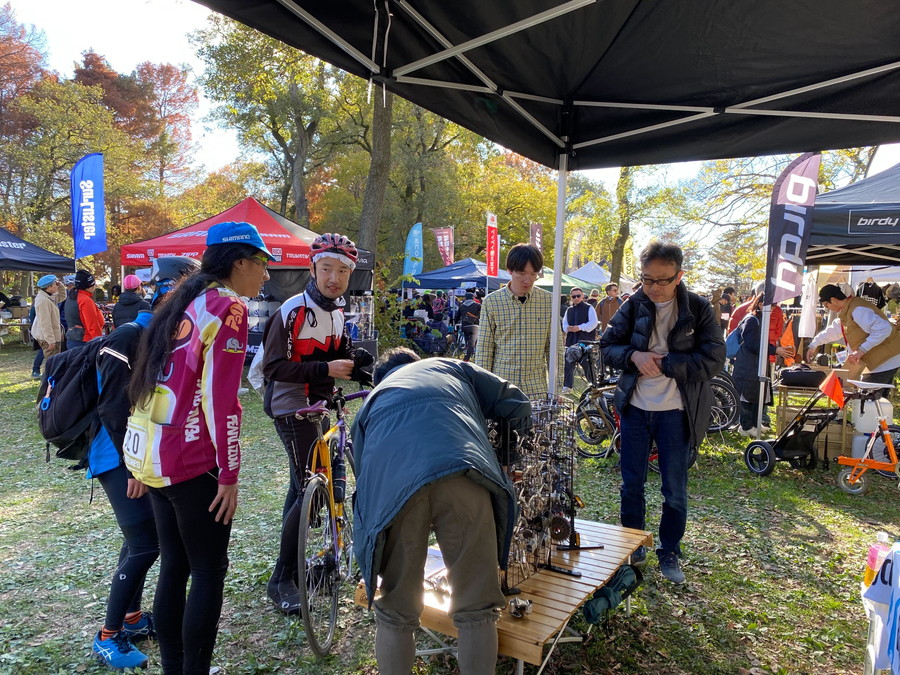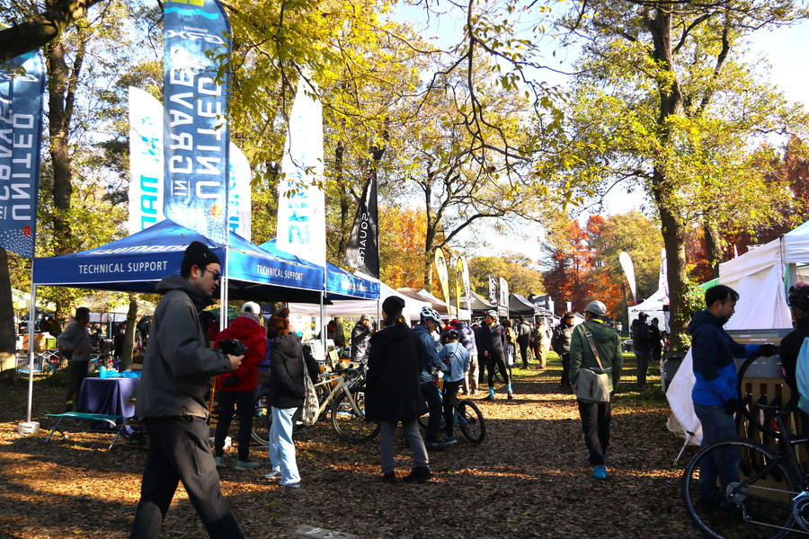 「秋ヶ瀬の森バイクロアは寒い」とよく聞くが、この2日間は快晴で日光にあたっていれば上着を脱いでもいいほど。まあ季節的に当然寒いのだが(笑)。会場には出展ブースから、多くのキッチンカー、子どもも遊べるエリアや愛犬も楽しめるドッグランもあり、自転車乗りやそうでない方まで多くの来場者が入り混じっていた。