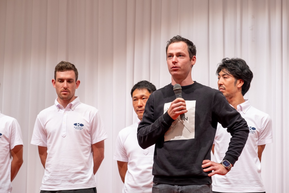 選手紹介で「コンニチハ!」と元気よく挨拶をしたレイモンド・クレダーは日系チームの在籍が7年目となる。ツアー・オブ・ジャパンステージ優勝をはじめ、UCIアジアツアーで多数の成績を残す。メインスポンサー株式会社キナン・角口賀敏会長も「良い形を皆さんに見せられるのでは」と大型フィニッシャーに期待を寄せた。