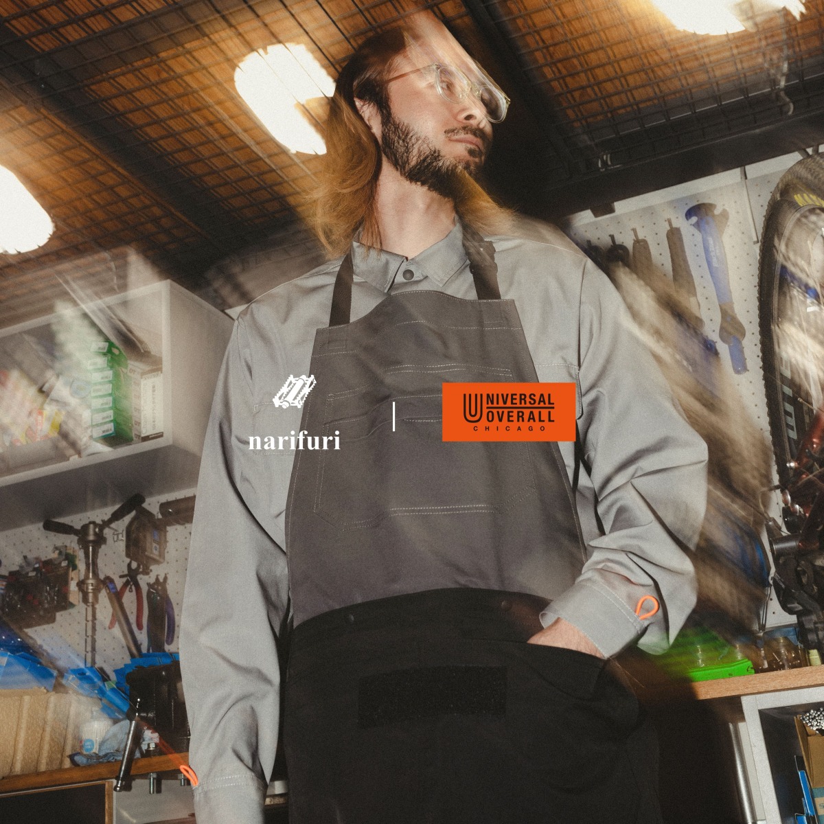 古き良きアメリカのワークウェアを提案するUNIVERSAL OVERALLのDNAに、narifuriのサイクリング・デザインや機能性を加えたコレクション全4型がラインアップします。今回のコラボレーションでは“メカニック”をテーマとし、ワークジャケット、ワークシャツ、トラウザーに加えて、メンテナンス時に着用するエプロンもリリース。