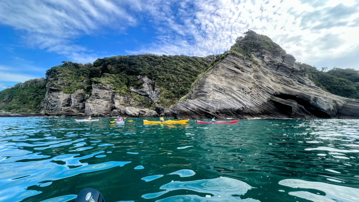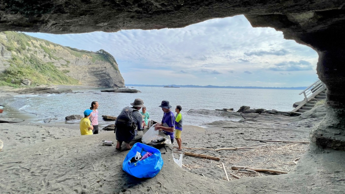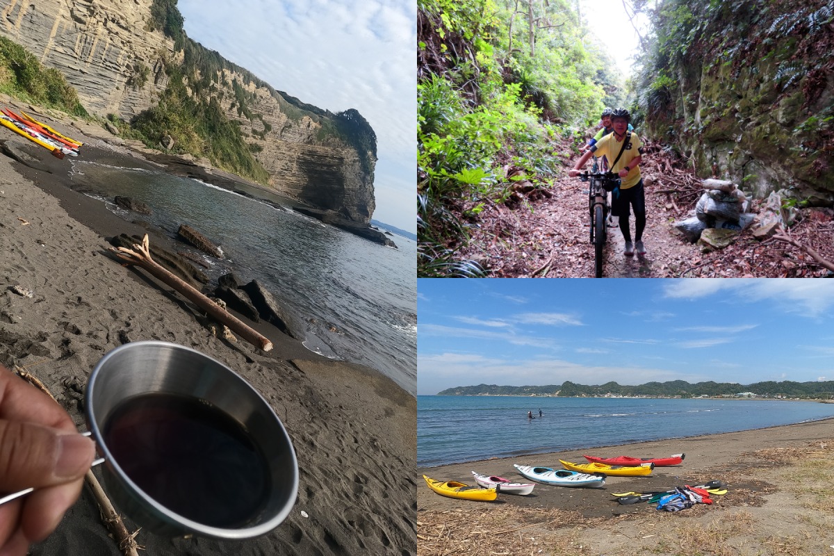 一度海に出れば、房総の海ならではの石切場を横目に、さらに海岸を囲うようにそびえる絶壁を眺めながらの海散歩が始まる。途中のシークレットビーチではコーヒーブレイクも楽しめる。カヤックを楽しんだ後は再度着替えて自転車へ。ゴールの北条海岸を目指す。