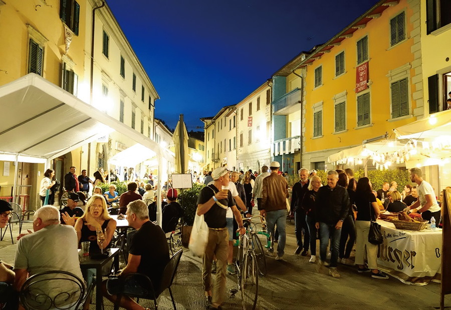 レストランやカフェの並ぶ村の中心部。エロイカ開催時の数日間は特別なにぎわい
