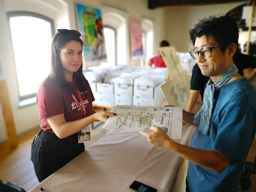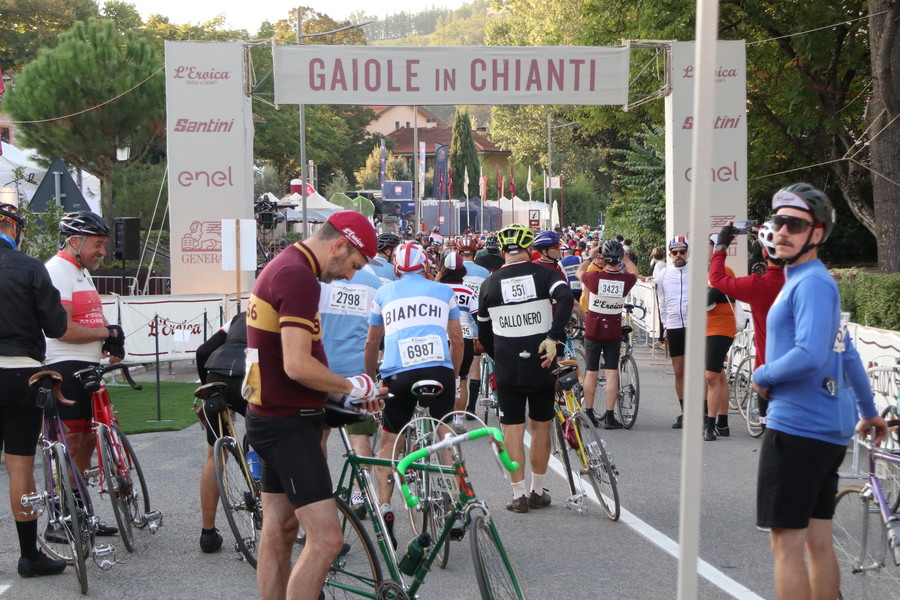 ガイオーレ・イン・キャンティ。村の入口に設置されたスタート地点。ウールジャージの参会者は、ここからスタンプを押してコースへ