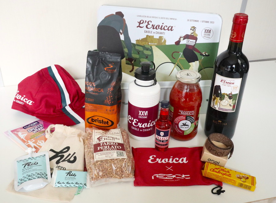 缶の中には、名産ワインのキャンティクラシコをはじめ、スポンサーのキャップやボトル、裾バンド、コーヒー、洗剤など盛りだくさん