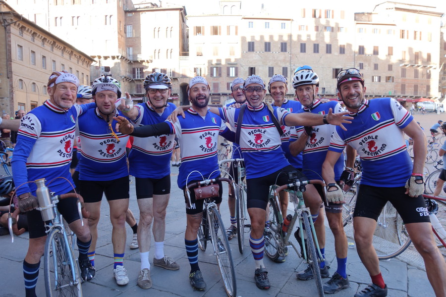最初のエイド、カンポ広場にて。おそろいのウールジャージで決めた陽気なオッサンたち、ノリは極めてよい