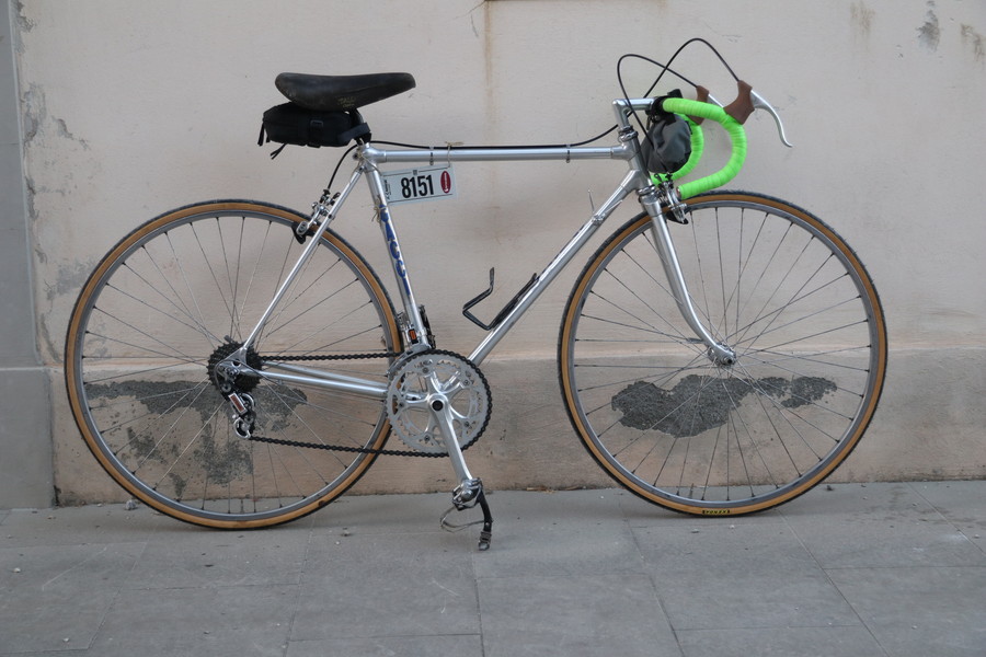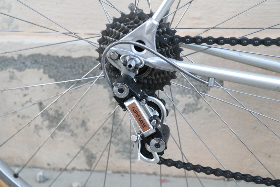 予約してヴィンテージバイクをレンタル。サイズ指定のみの巡り合わせで、編集部ニシヤマが乗ったのは、80年代のアラン製アルミバイクだった。メカはシピンメのLJ4000で自分が使ってる変速機より高級かも。柔らかいふにゃふにゃのアルミ接着フレームだったが、ダートでは振動吸収効果が意外と功を奏した。