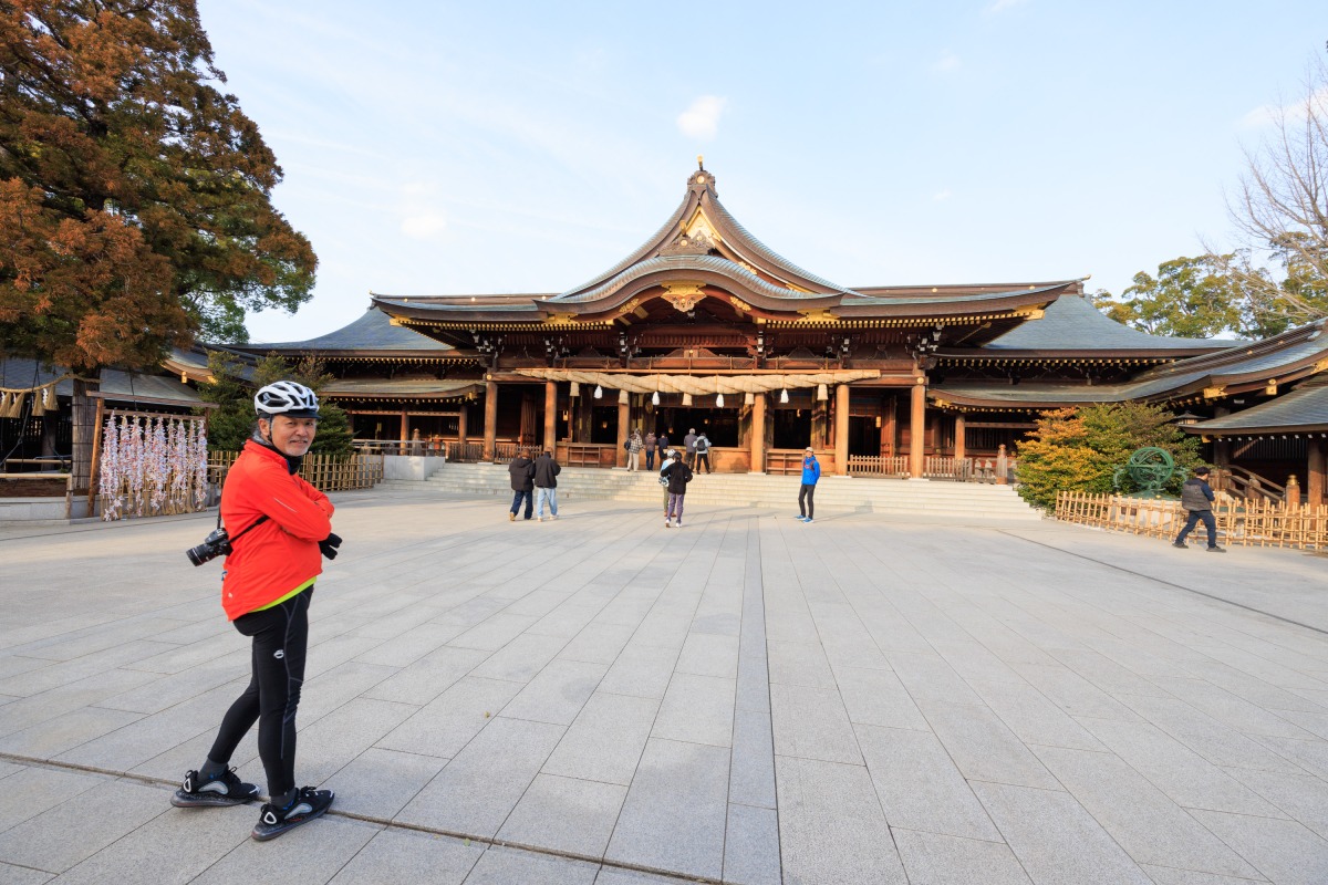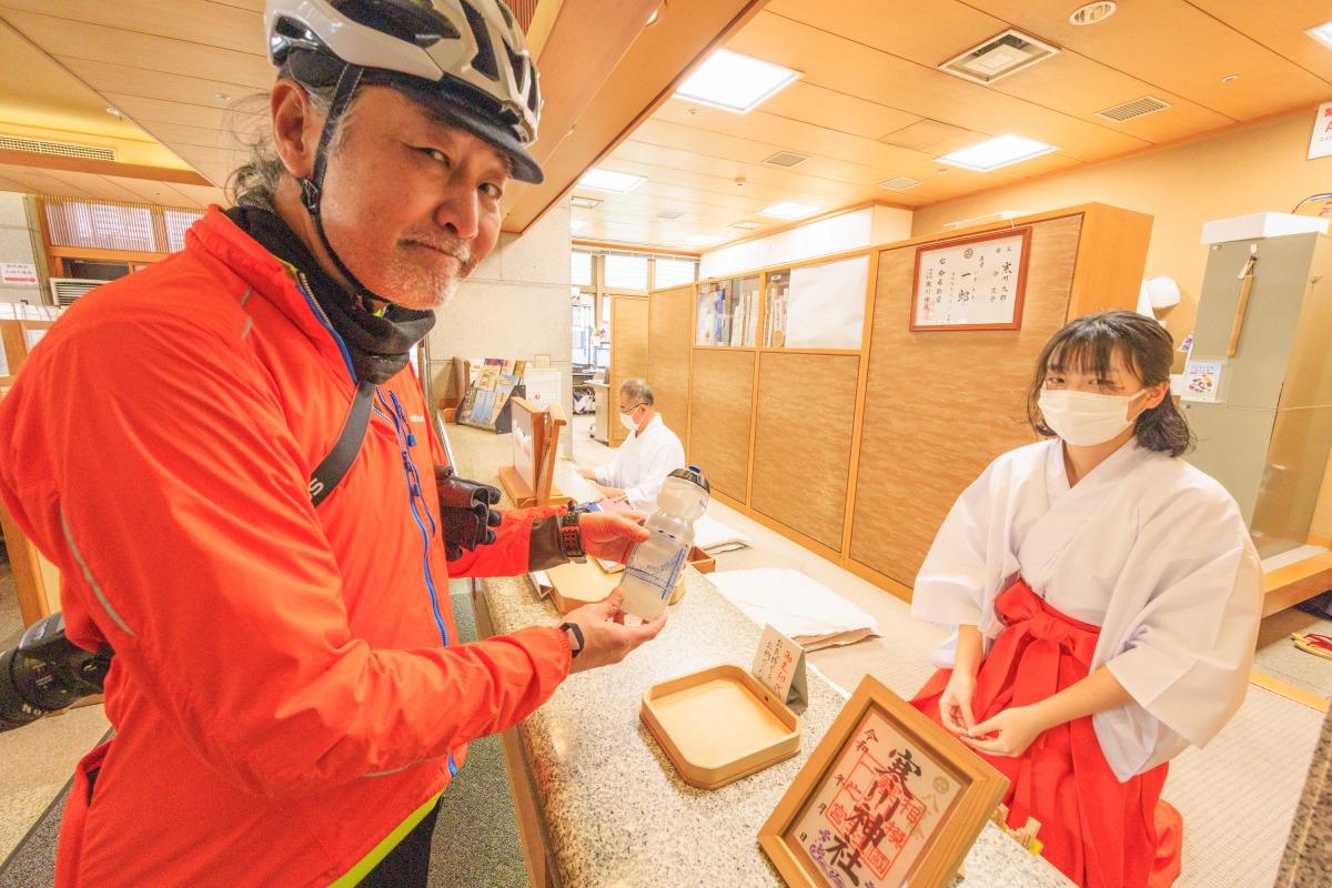 柳島スポーツ公園をあとにし、県道46号を北上。ここも交通量が多めだが、すっかり打ち解けた参加者たちとおしゃべりしながら、またしてものんびり走る。柳島スポーツ公園の責任者、萩原さんも加わり、地元の話などを聞きながらペダルを踏むと、あっというまに寒川神社。ここは相模国の一宮として知られ、約1600年の歴史をもつ由緒ある社。俺も名前は聞いたことがあったがじつは訪れるのは初めて。迫力ある門や立派な社殿に圧倒されながら境内を散策。そして境内には御神水がくめる場所があるということで、それを探してうろうろしてみた。結局それは社務所でくんでもらうものだということがわかり、社務所で無事ゲット。ここでタンデムの方々とはお別れ。またいっしょに走りましょー!