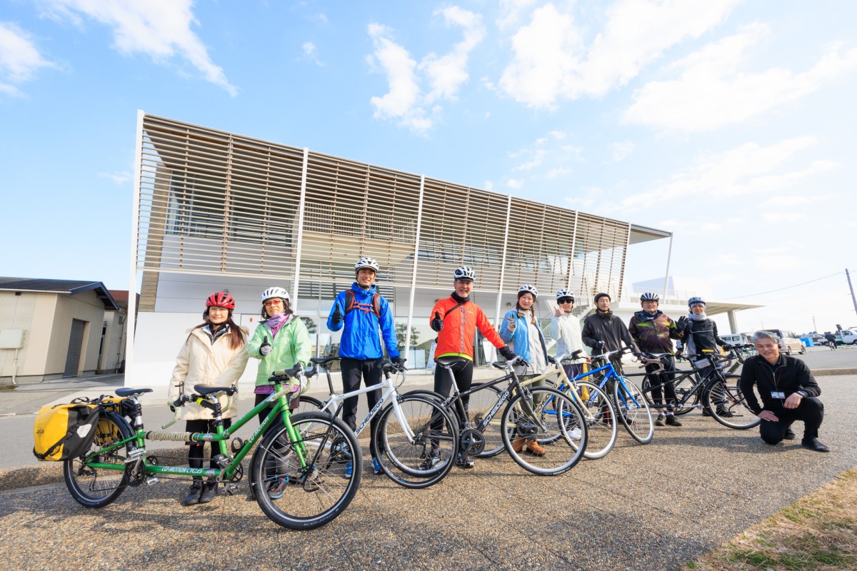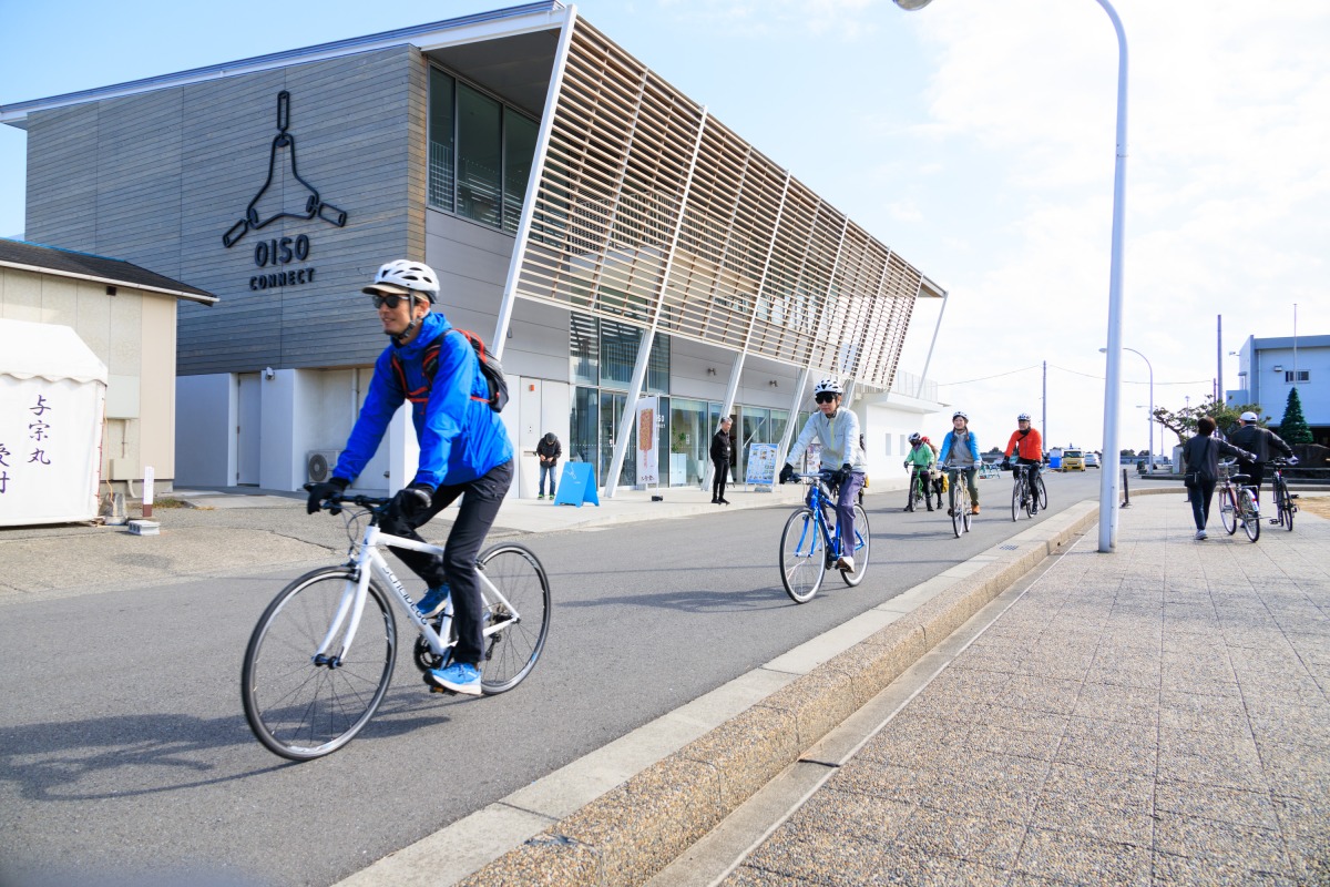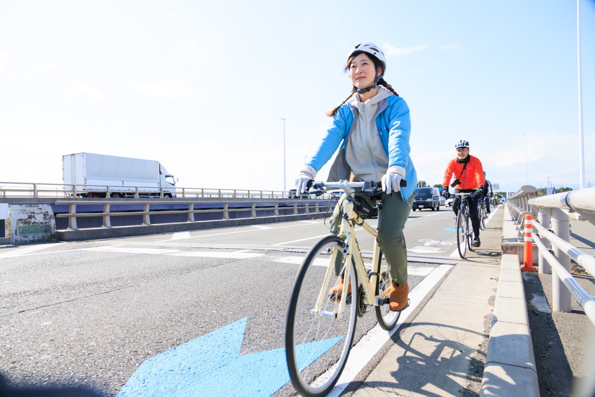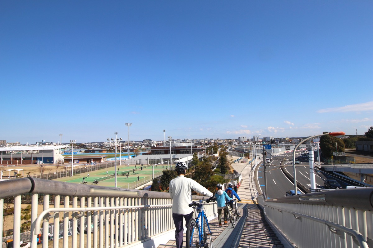 今日走るのは、ジャパンエコトラック神奈川のうち、「太平洋岸自転車道神奈川セクション」と「相模原〜茅ヶ崎サイクリングルート」の一部。軽く本日のブリーフィングを受けたあと、それぞれ自己紹介して、さっそくサイクリングスタート。目的地は茅ヶ崎市にある柳島スポーツ公園だ。大磯港から東へ進み、すぐに国道134号へ。ここは交通量が多く走りにくかったが、適宜歩道を走ったりすれば橋の上からの景色など、それなりに楽しめる。対向車線をロードバイクがかっ飛んでいくのを横目に、われわれはマイペース。なにせグループにはふだんはほとんど自転車に乗りません、っていう女子が2人もいて、ガイドしてくれるモンベルのスタッフも、スローペースでエスコート。