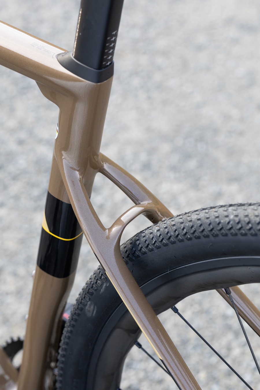 レイブシリーズ最大の特長はグラベルレースをターゲットとしたものであるということ。そのためフレームには空力性能に配慮した形状が与えられた。ステアリングまわりについても、ブレーキケーブルがバーテープエンドからステムまでわずかに露出する仕様で、整備性と空気抵抗の軽減を両立している。またアクセサリー類の装着に用いるボトルケージ台座もロードバイクと同様に最低限としている。幅42mmのタイヤを装着できるクリアランスが確保され、舗装路からグラベルまであらゆる条件に対応したセッティングが可能だ。ちなみにツーリングやアドベンチャー的な用途については同社のジェナや同じくニューモデルのアドラーが担っている。