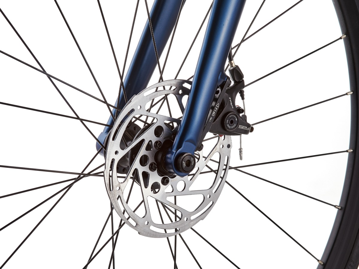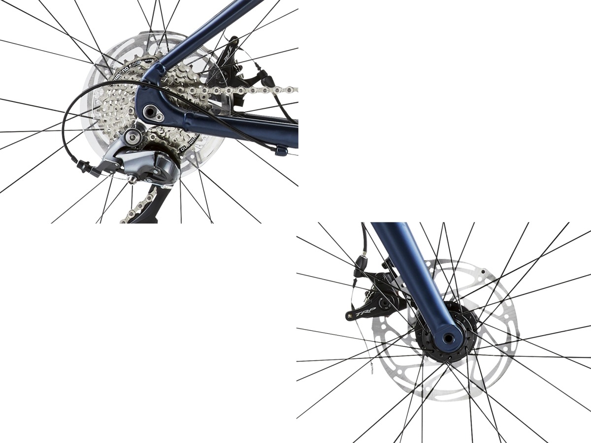 また、急な停止や下り坂、悪天候時でも確実な制動力を発揮するディスクブレーキを採用しており、安全かつ快適にロードバイクを楽しむことができます。メインコンポーネントに優れた操作性を誇る信頼のシマノ社製「CLARIS」を採用。