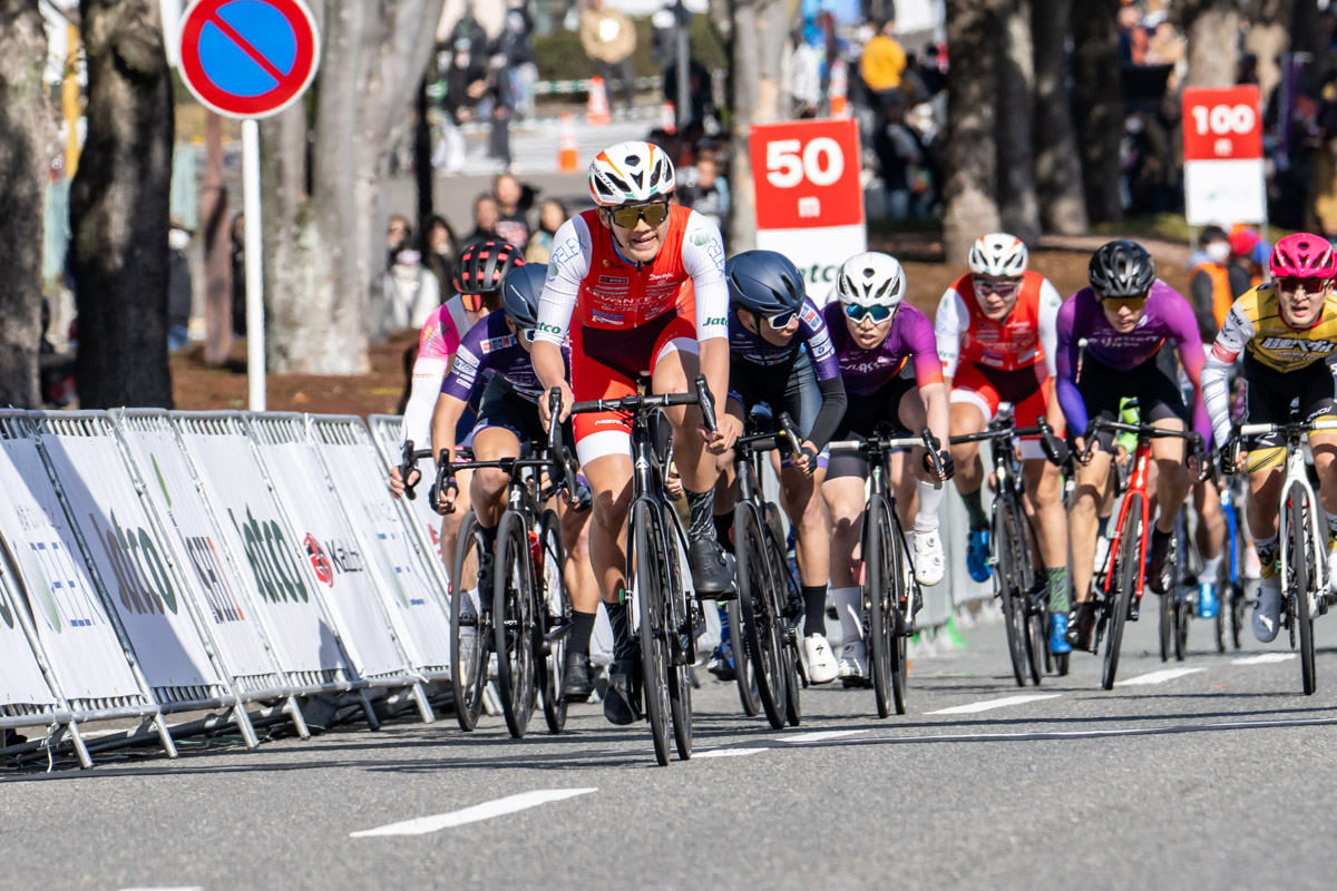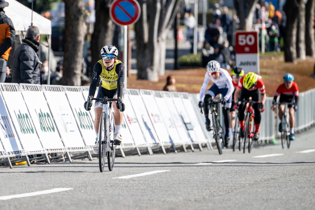 ラスト1周に入るタイミングでもBSやキナン、シマノ、愛三らが先頭を固める中、地元・レバンテフジ静岡所属で、出身も地元静岡県の 高梨万里王が集団後方からラインを1人変え、フィニッシュライン手前の上り坂を利用してアタックしていく。