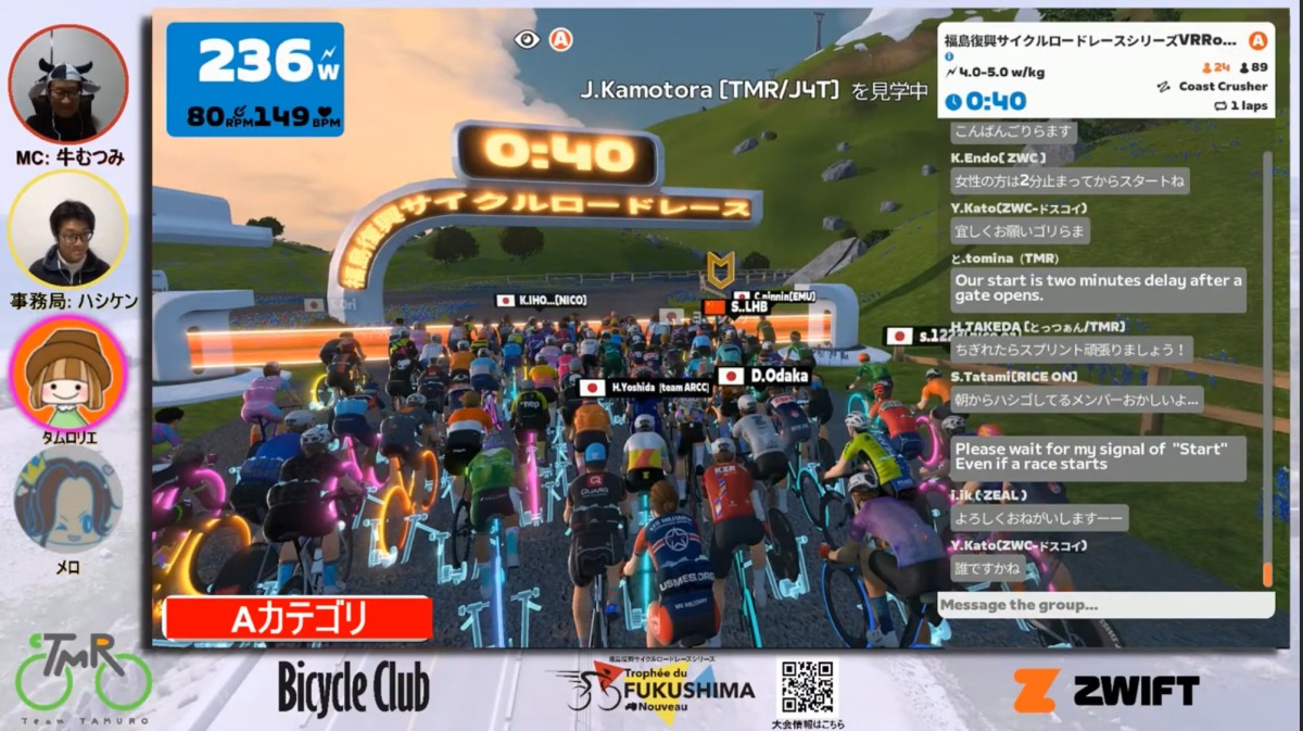 さらにレース配信中に実際のZwift走行場面を生中継するため、TMRチームからBクラス参加のD.Shimiさん、女子Eクラスのtominaさん、そして普段はレギュラー解説を務めているKENTAさんがAクラスに参加!と各々スタンバイ。そしてゲスト解説のタムロリエ氏をサポートしながら、中継を盛り上げてもらうために急きょ、イケボで定評のあるメロちゃん(EMU SPEED CLUB)も解説としてボイス参加。準備万端となったタイミングでスタートの夜8時を迎えた。