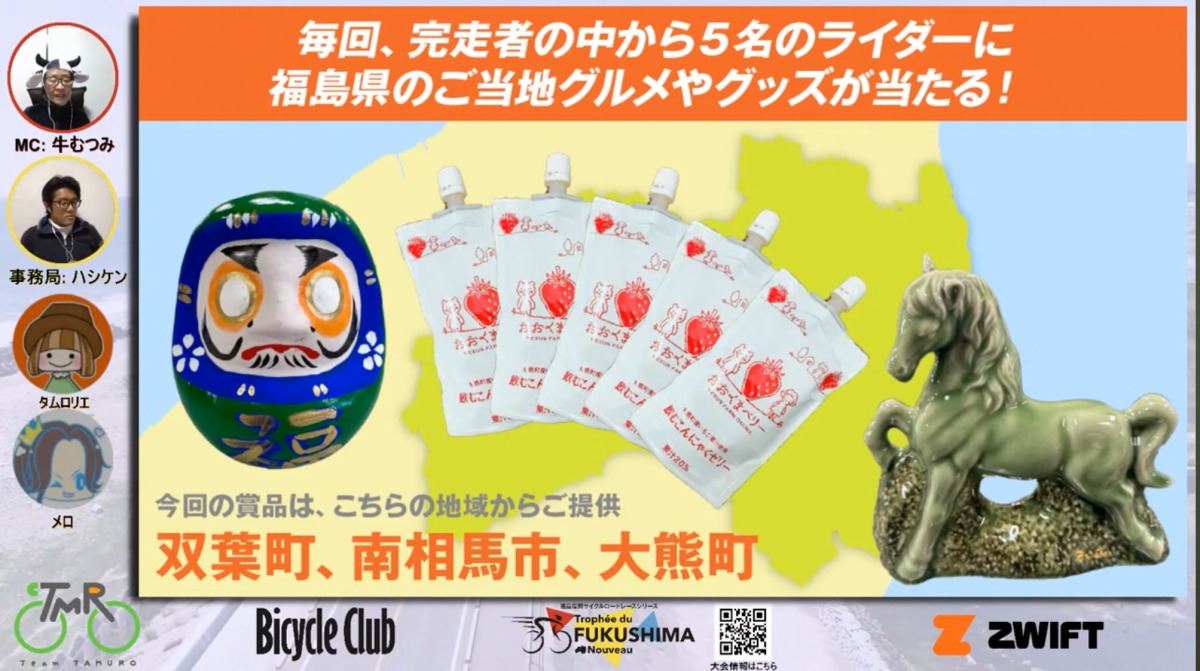 スタート前には前回のグループライドを完走した参加者の皆さまから抽選で5名に当たる「福島県の名産品・工芸品」として、双葉町、大熊町、そして今回のレースのコンセプトにもなっている南相馬市の品が紹介され、フクシマ気分が盛り上がる。
