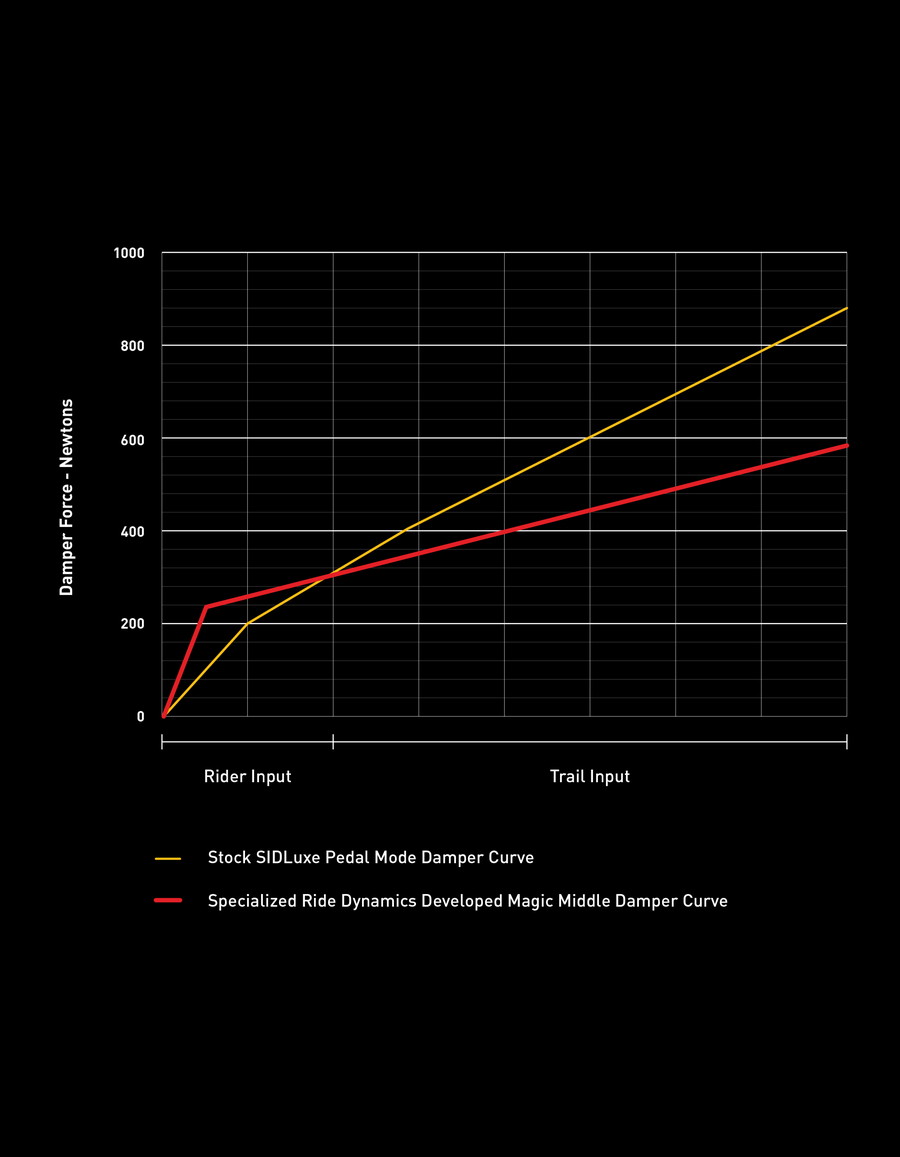 これらを可能としたのがジオメトリーの見直しとサスペンションのチューニングだ。ヘッドチューブアングルを0.7度寝かせBBハイトを8mm下げるなどで走破性向上を目指した。この変更のみでは上りでの性能が失われてしまうところを補うのが、スペシャライズドが独自にチューニングを施したサスペンションだ。サスペンションのモード選択はワイドオープンとマジックミドル、スプリント・オン・ロックの3種類を用意した。ペダリング効率に優れながら、荒れたセクションでアクティブな動きを可能にするマジックミドルを基本としながらも、サスペンションの性能を最大限に発揮させるワイドオープンとペダリング効率を最大化するスプリント・オン・ロックを併用できる仕様となっている。これにともなって前作まで採用されてきたブレインショックは廃止されている。