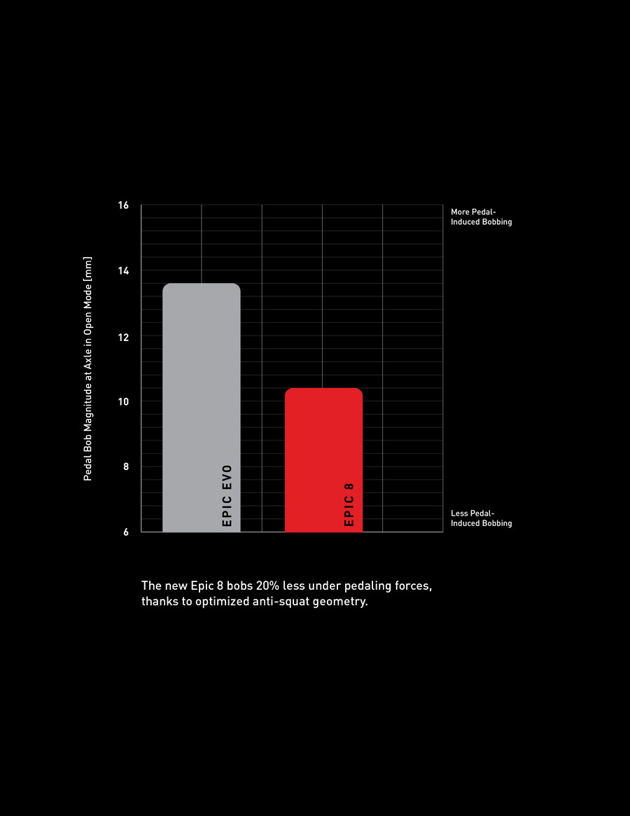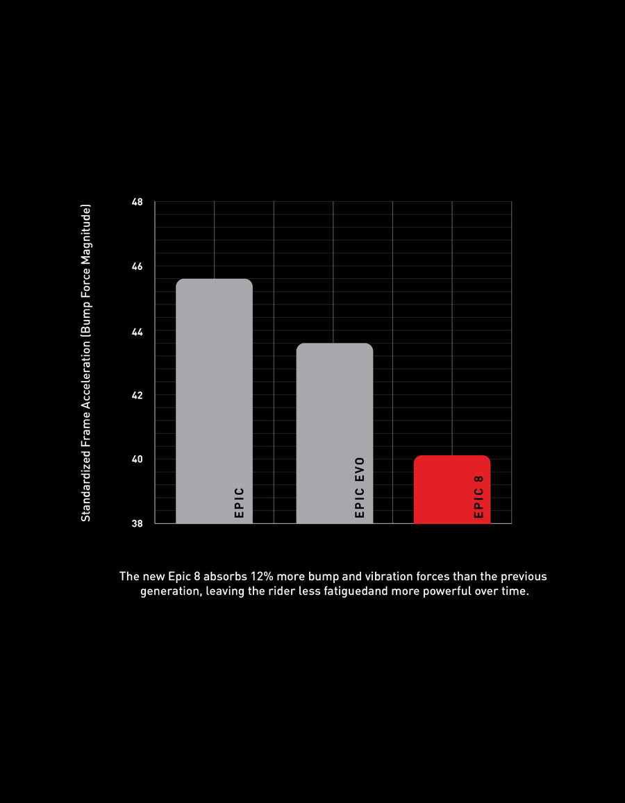 オフロードでの最速バイクを目指して開発されたエピック8は、前作でダウンカントリーバイクとして位置づけられながら、ハードになるクロスカントリーのコースに対応するために多くのレーサーが競技で使用していたエピックエボをベースに開発が進められた。前後のサスペンションはストロークを100mmから120mmにロングストローク化。下りでの走破性を高めたことでライダーは体力を温存し、上りに備えることができる。