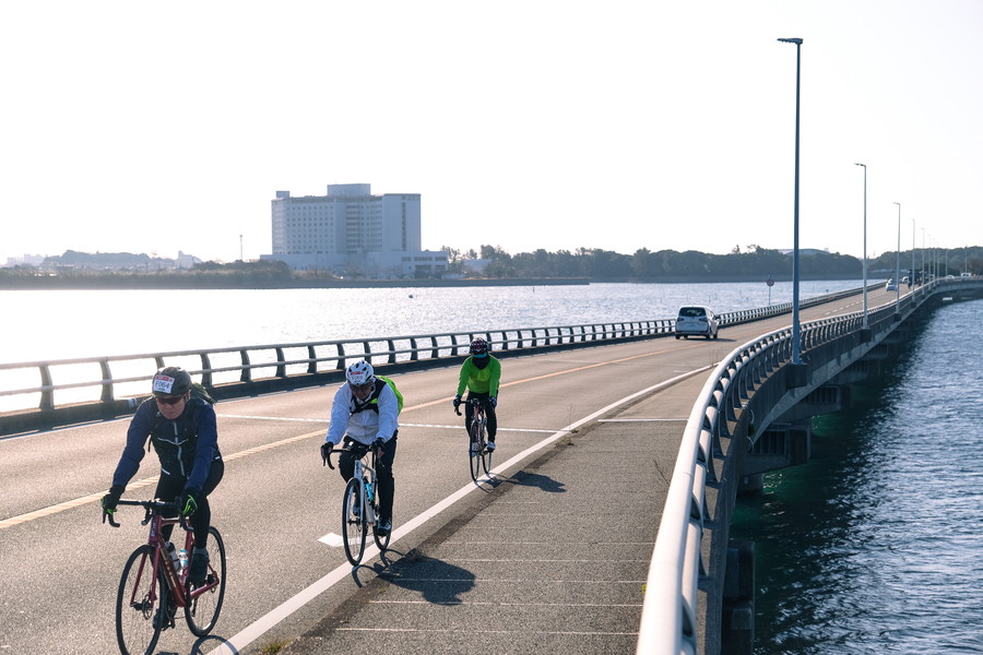 基本的には道路に記された矢羽根型の標示を伝っていくと浜名湖を周ることができるため、迷う心配はほぼ無い。出発後、早速名所である浜名湖大橋まで到達。朝日を浴び、潮風を受け、開放的な景色を味わうことができる。