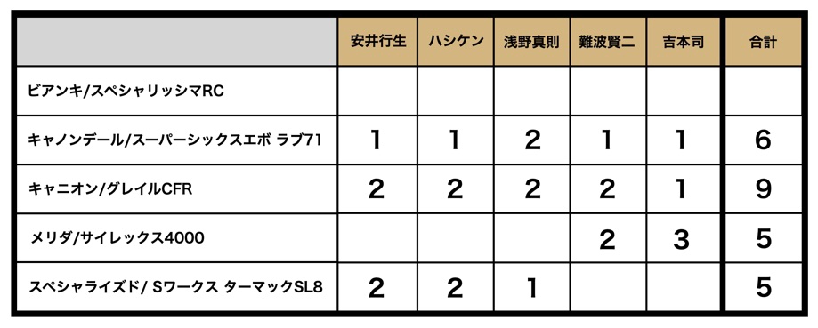 先んじて発表された5ベストを対象に、ひとり持ち点5点で、1モデルへの最高配点3点として採点。集計の結果、バイシクル・オブ・ザ・イヤー2024の大賞は、9点を獲得したキャニオン・グレイル CFRという結果となった。