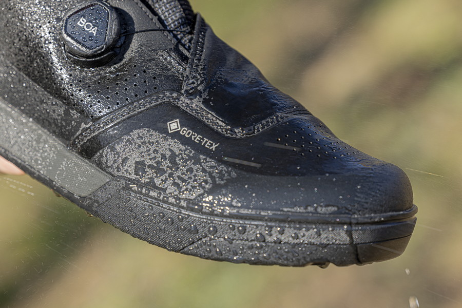 イギリスのMTBシーンのように雨天の多いグラビティライドをものともしない全天候型モデル。ゴアテックス素材に加えて、足首まで保護するストレッチアンクルカバーや、低温でも安定したラバー性能を発揮する寒冷地用のアウトソールを採用する(ロゴカラーも低温用に識別)。