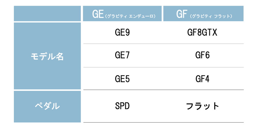 松井正史さん(以下、松井):AM、ME、GRシリーズを整理して刷新したのがGEとGFです。本格的なダウンヒルや、上り下りを織り交ぜたトレイルライド楽しめるシューズで、GEがビンディングペダル用、GFフラットペダル用になっています。それぞれグレードの異なる3モデルを用意しています。