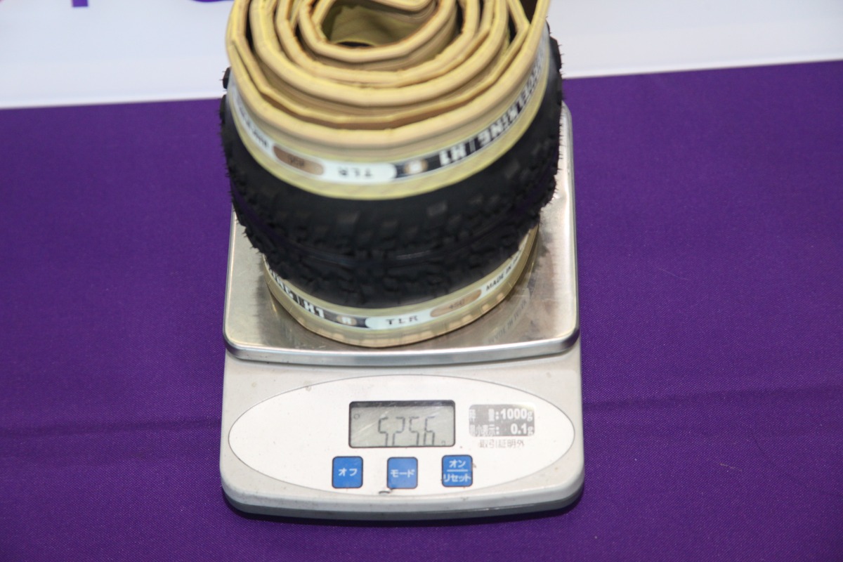 今回のグラベルキングリニューアルにおいて、「X1」の登場の他に目を引いたのが新スペックの登場だ。今まではオーソドックスな無印と、耐パンク性能を強化した「+(プラス)」のシリーズの2種類。そこに新たに加わったバリエーションの「R(アール)」はより軽さとしなやかさを追求した高スペックのラインだ。重さはとても分かりやすい指標なので実際に計測してみた。