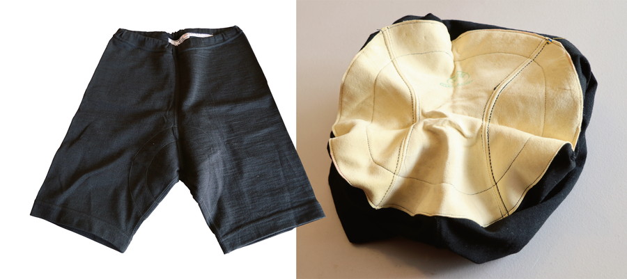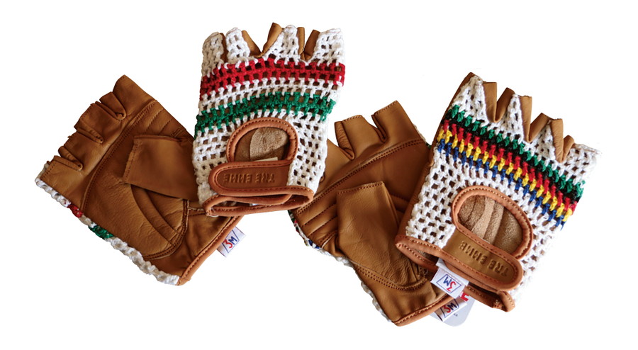 当時モノのレーサーパンツは、パットにセーム革を貼ったもの。ブラックのベーシックなレーサーパンツを履くのもありだ。ニシヤマ的には、ナリフリのサイクルカーゴスパッツがオススメ。グローブはクラシカルなメッシュがいい。現行品でも手に入る。