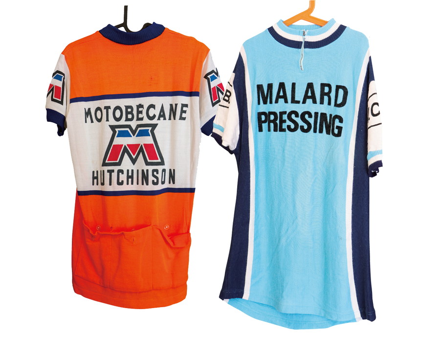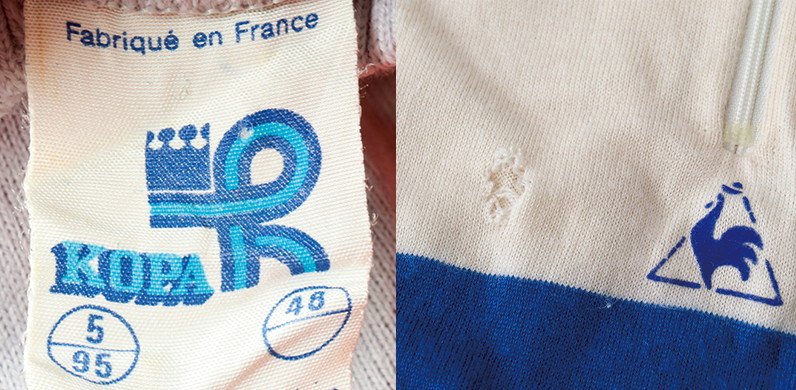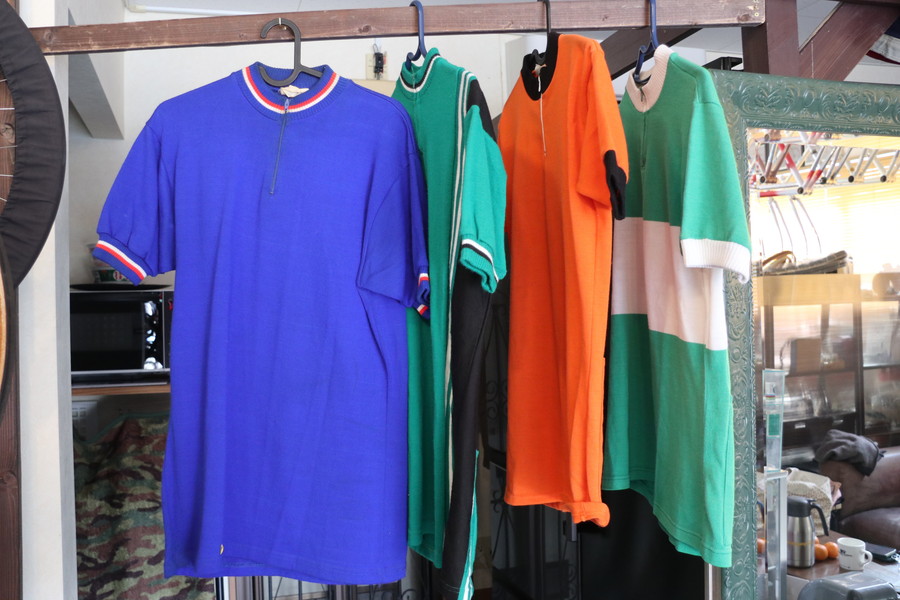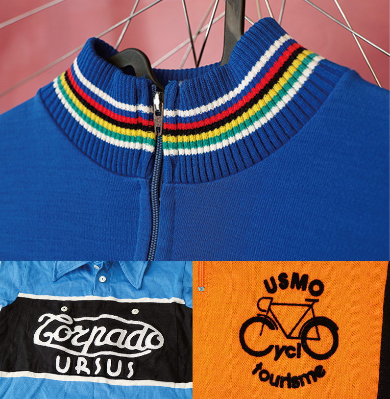昔のジャージの多くは、既製品の下地柄のウェアがあって、それを入手して後に刺繍やアップリケでチームやメーカーの柄が入るシステムだ。クラシカルジャージをよく見ると、いくつかのパターンの下地柄と色違いに分別できる。無ネームをシックに着るのもいいし、自分でアップリケを付けるのもあり。