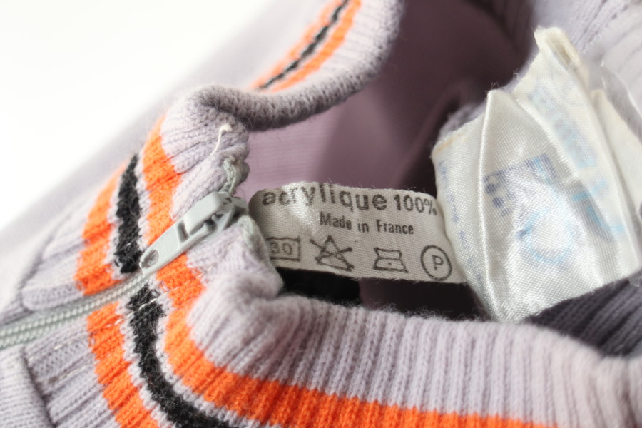 ウールジャージとよく言われるけれども、当時モノとして入手できる古着ウェアは、アクリルなど合成繊維のものがほとんど。60年代初期ぐらいまではウールだが現存数は少ない。逆に下の写真の再生産モデルなどはウールだが、1着2万円くらいと高価だ。チクチクしない70年代アクリルのほうが合う人も。