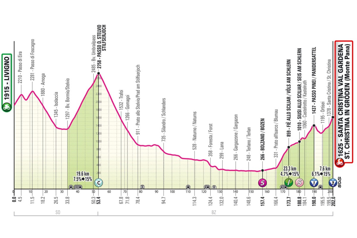 重要な山岳ステージは前半では第2ステージのオロパで、他にも第8ステージのプラティ・ディ・ティーヴォや第10ステージのナポリからクザーノ・ムトリまでが挙げられる。さらに最終週には第15ステージのリヴィーニョやパッソ・デッロ・ステルヴィオ、第17ステージのパッソ・ブロコン、そして第20ステージのモンテ・グラッパが含まれ、ここで総合優勝がほぼ決定したあとローマでの最終ステージに挑む。