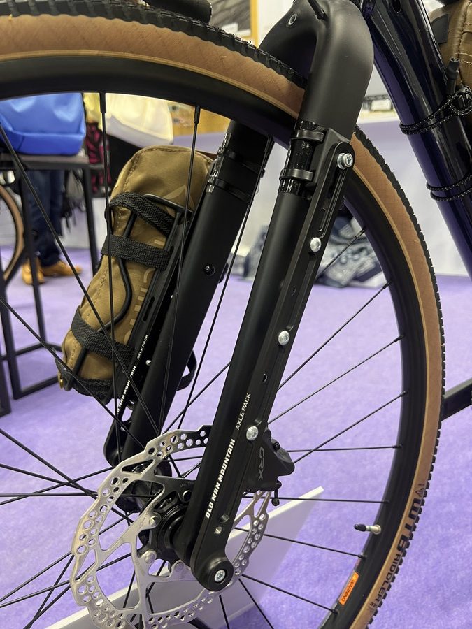 多彩な積載系パーツを展開する同社だが、コチラはホイールのアクスルに固定できるのでダボがないフォークでも積載でき、車軸に重心が載せられるので安定性が良いとのこと。