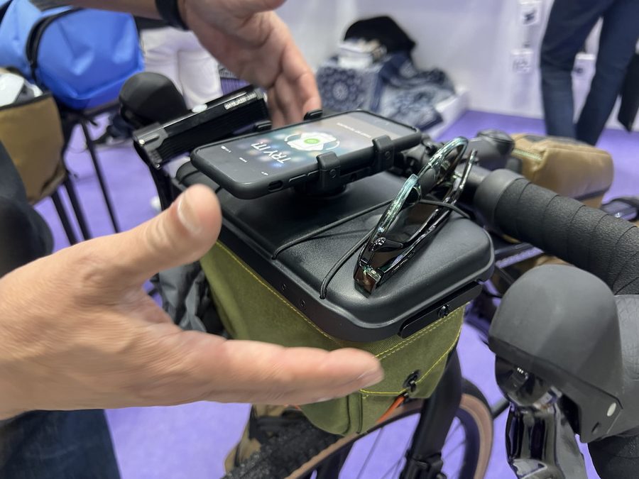 次にオススメなのが、ROUTE WORKSのハンドルバッグ。乗車しているライダーにとって使いやすい開閉の向き、上蓋にはWahoo、Garmin、Quad Lock、SPコネクトに加えてPEAK DESIGNもアダプター対応予定!
