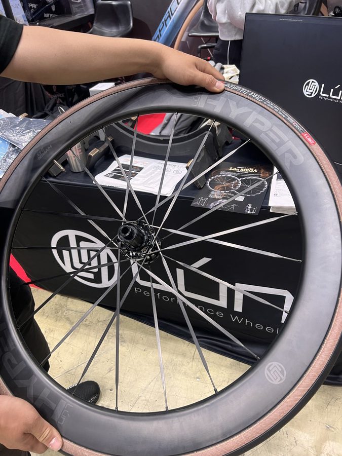 主力製品は同じグループの別ブランド「LUN」というホイール。なんとカーボンのブレード形状のスポークをあしらう。LUNメガは前後セットで45.8万、LUNハイパーは18万という、この構造からしたら驚愕の安さと言えよう。