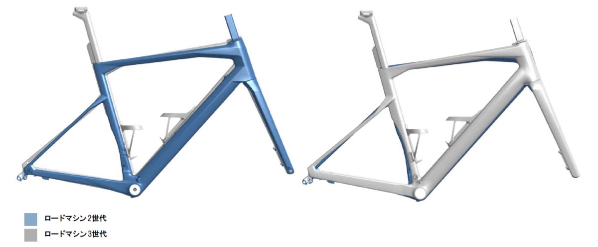 またフレームジオメトリーも、進化を遂げている。上の表は、ロードマシンの第2世代と第3世代のジオメトリを比較したものだ。
