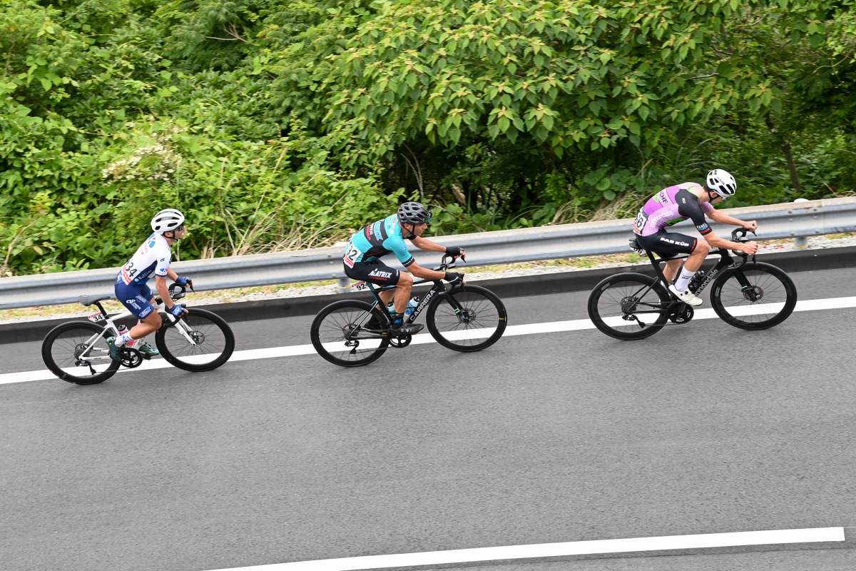 中間スプリントの直後、ホセ・ビセンテ・トリビオ(マトリックスパワータグ)、フィンレー・ウォルシュ(キャッシュ・パー・クップ)、山本元喜(キナンレーシングチーム)の3名が逃げを打つ。
