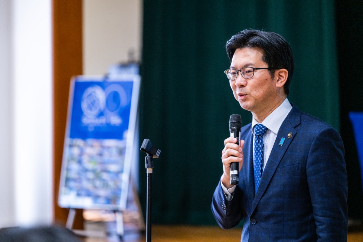 冒頭で挨拶をする米子市の伊木隆司市⻑、日ごろから弓ヶ浜の景色を楽しんでいる