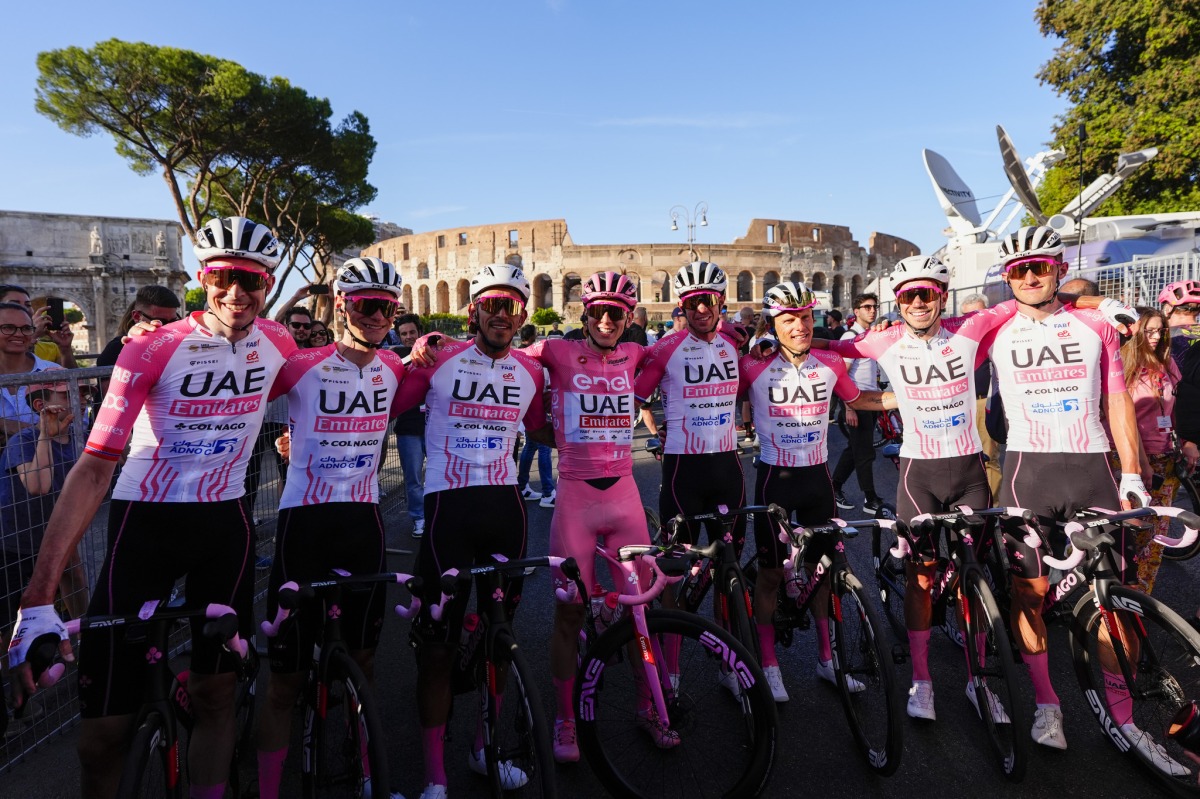 最終・第21ステージでは、全身バラ色に身を包みパレード走行に臨んだポガチャル。チームメートもピンクのアイウェアと、肩にマリア・ローザカラーを施したスペシャルジャージを着用し、ポガチャルの、そしてチームの勝利を誇示した。