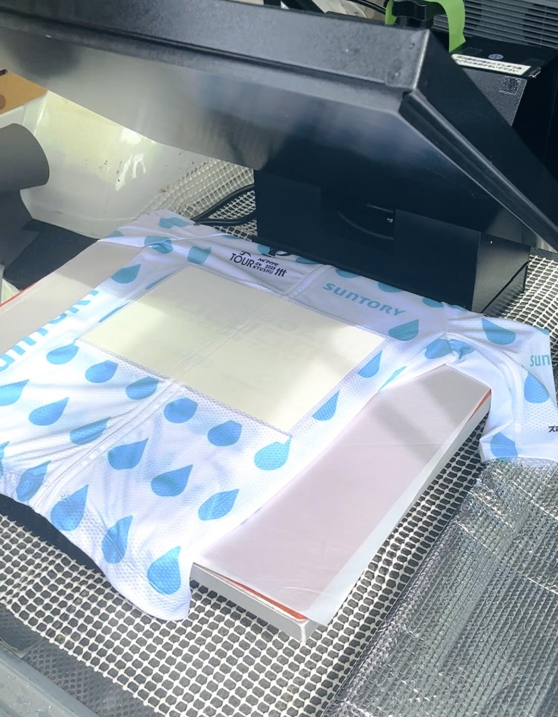 昨年、パールイズミでは『マイナビ ツール・ド・九州2023』向けのチャンピオンジャージをデザイン・生産した。また実際に大会現地のステージレースに同行し、レース終了後に昇華転写のプリント機で各賞のリーダージャージ(パールイズミ製)に各チームのロゴをプリントする。どのチームが獲得するかわからないリーダージャージは、現地でプリントされているのだ。