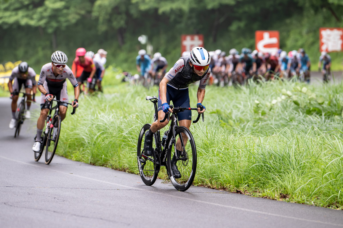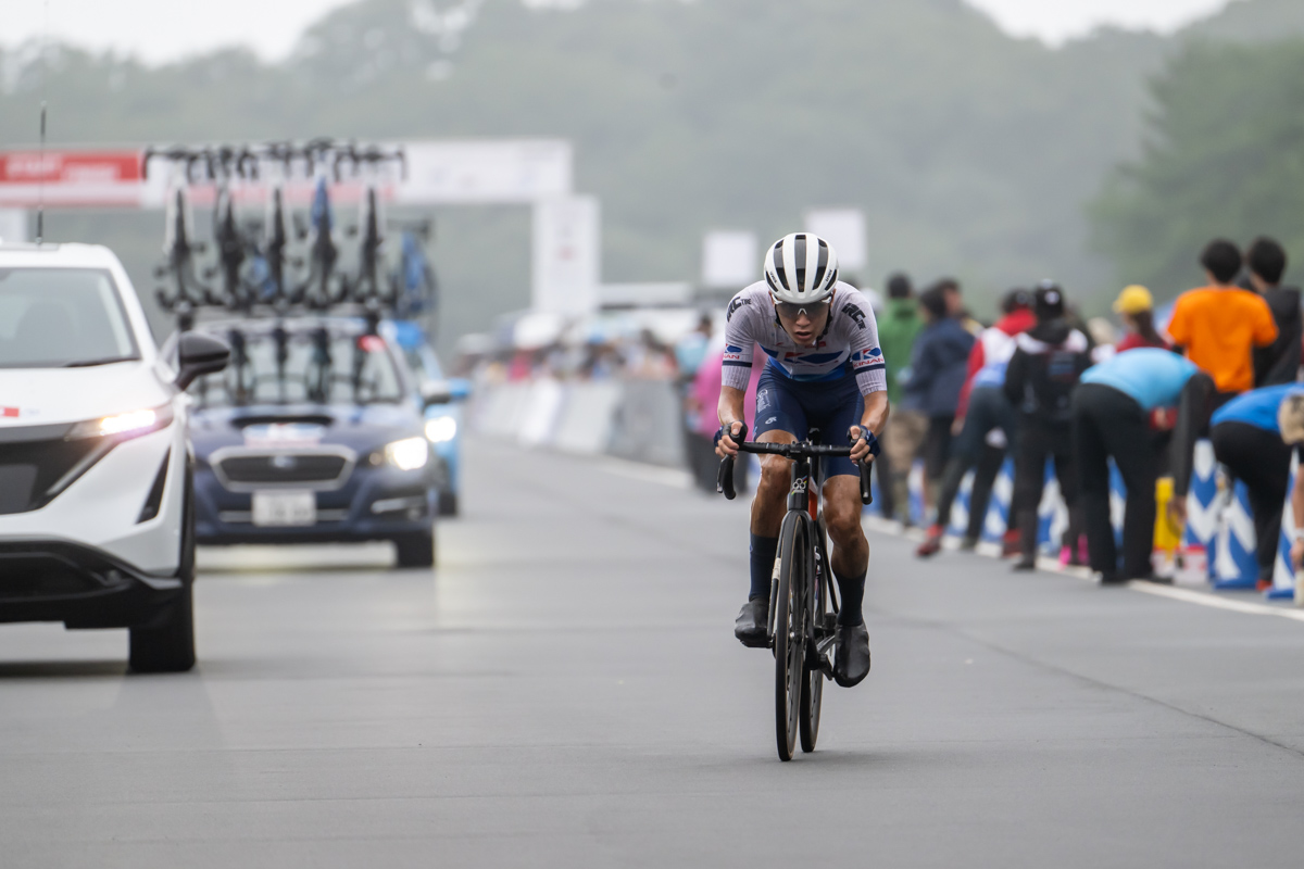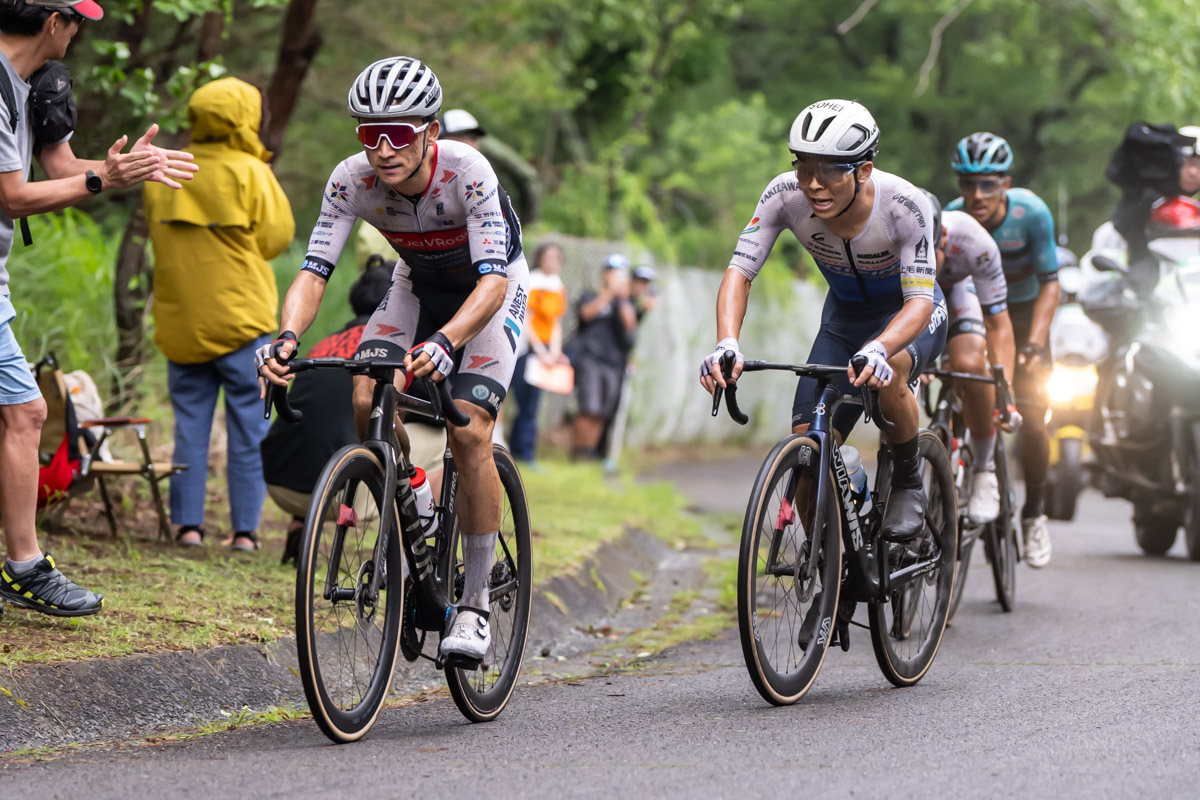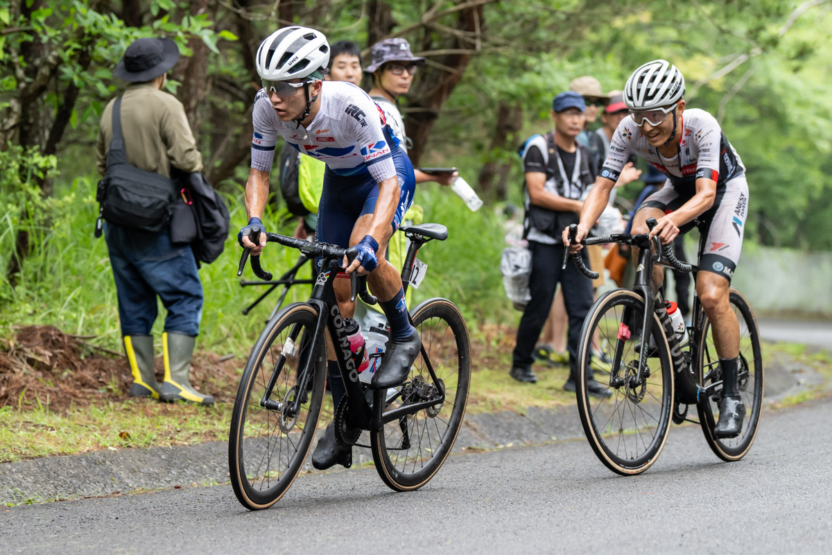 一昨日のタイムトライアルで2位となった宮崎と、2019年と21年の2度全日本タイムトライアルチャンピオンに輝いた増田という独走力のある2人は、合流時は10秒差だった集団とのタイム差をどんどん開き、最大で2分40秒まで開いた。