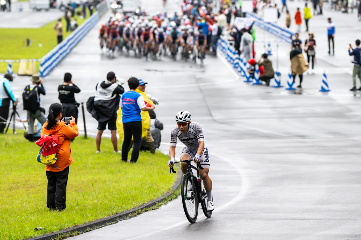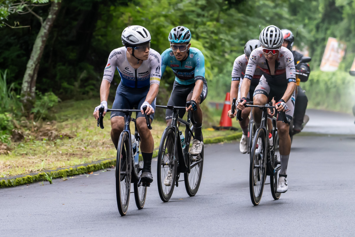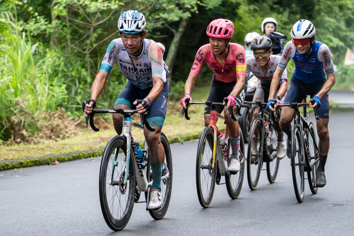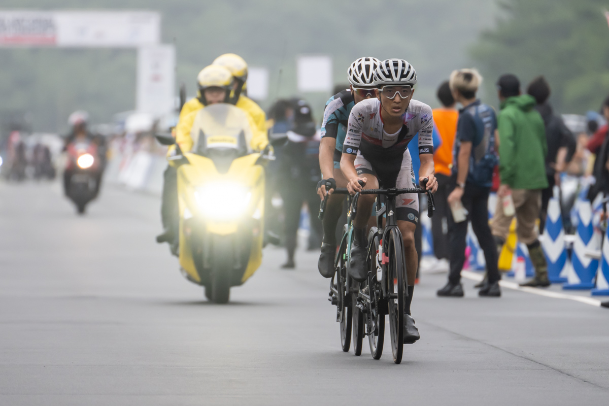 しかし、2周目には集団が井上を吸収。そして、桂慶浩(ヴェロリアン松山)と香山飛龍(シマノレーシングチーム)の2人が抜け出し、それを横矢峻(アヴニールサイクリング山梨)と河野翔輝(チームブリヂストンサイクリング)が追走し先頭は4人へと入れ替わる。この逃げは最大10秒差まで広がるものの、集団が吸収。そして3周目もアタックがかかるものの、集団は一つでレースが進んでいった。