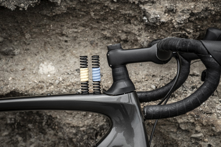 Roubaixはその間にも独自の進化を続けていたが、このバイクを象徴するものははやりFuture Shockだろう。ヘッド部分に衝撃吸収のサスペンション機能を持ち込んだ先駆的な機構だが、アップデートも重ねており、現行のFuture Shock3.3ではロックアウトだけでなく、内蔵スプリングの差し替えによってサスペンション機能の強弱を選べる。ポジションや走行環境に合わせてプリロードを細かく調節し、好みの固さにセットできる。コンプレッションは路面に合わせて、走行中に細かく調節できるようになった。