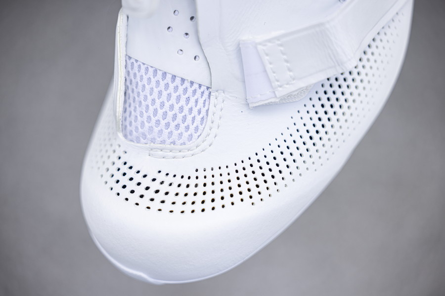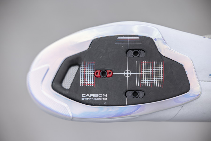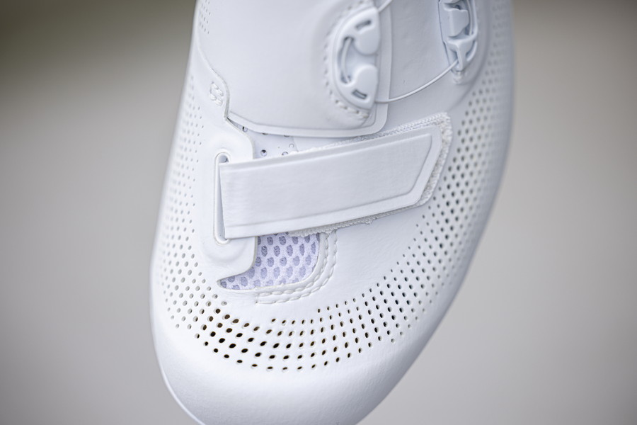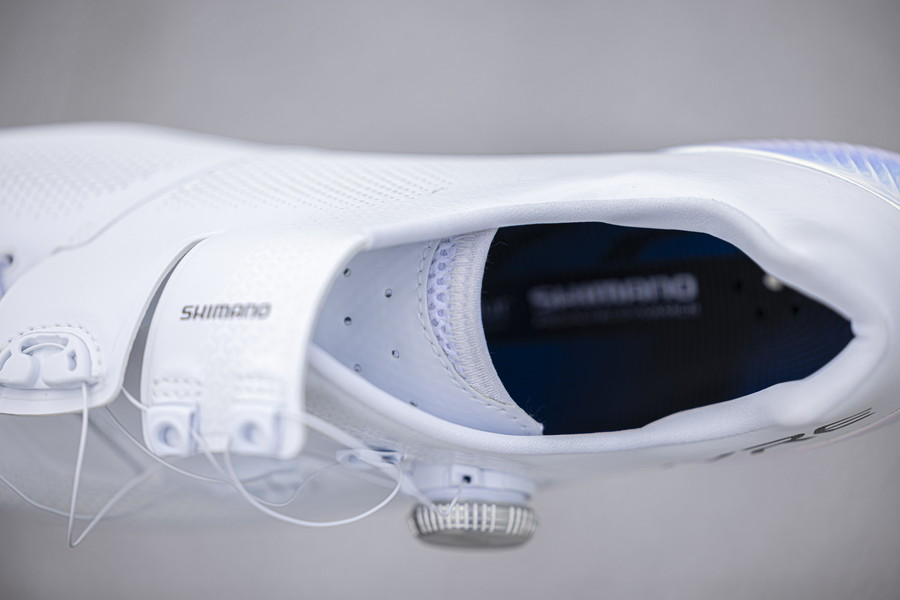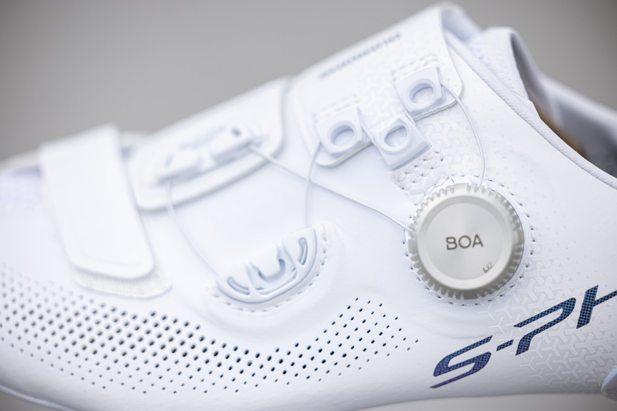 クロージャ―システムは、メタル製のボアダイヤル+パワーブーストガイド、トゥストラップで構成され、強い締め付けを可能にするとともに、シュータン(甲部を覆うパーツ)によってペダリングの安定性を高めている。加えて、フィット感とパワー伝達性を高めるために、サラウンドラップ構造やシームレスミッドソール構造、アンチツイストスタビライザーなど、シマノの誇るテクノロジーが惜しみなく注ぎ込まれている。アッパーは軽量で通気性に優れたマイクロファイバーシンセティックレザーで、アウトソール剛性はシマノのシューズの中で最も硬い12だ。