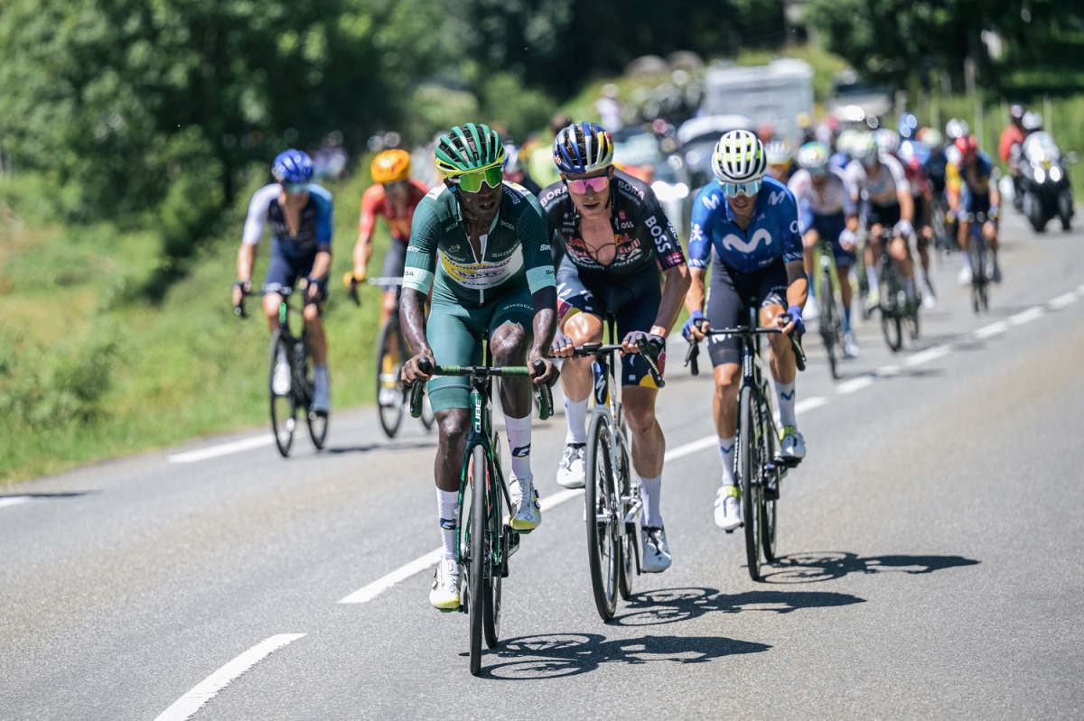 新たな動きは20km地点を過ぎたところで生まれて、ボブ・ユンゲルス(レッドブル・ボーラ・ハンスグローエ、ルクセンブルク)のアタックをきっかけに約20人が前線へ。幾分のシャッフルを経ながら、21人の先頭グループが形成された。この中にはマイヨ・ヴェールのビニヤム・ギルマイ(アンテルマルシェ・ワンティ、エリトリア)の姿も。37km地点に設置される中間スプリントポイントへ向かって、一緒に前に乗ったルイス・メインチェス(アンテルマルシェ・ワンティ、南アフリカ)のアシストを受けながら進んでいく。