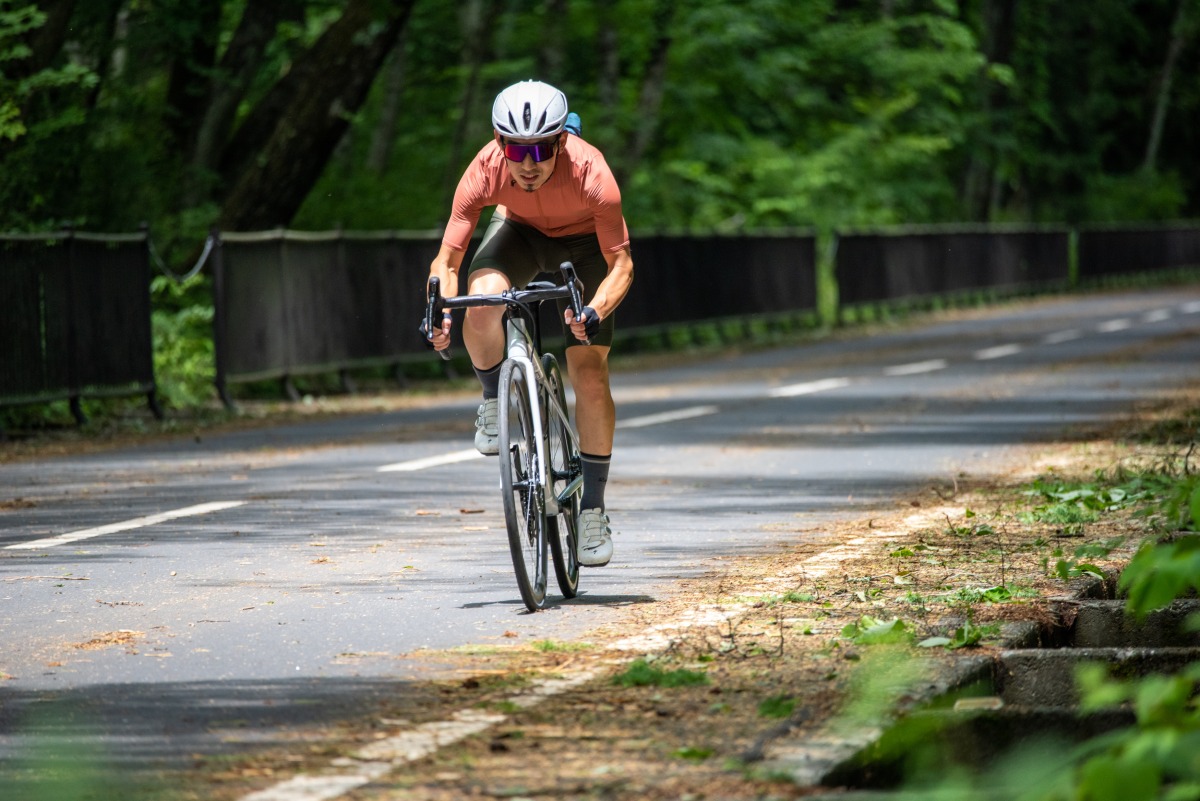 しかし、大トルクでのダッシュ、スプリント的な加速、激坂をよじ登るようなダンシングなど、高負荷になると一転、フレーム剛性が高くなるような印象を受ける。ここまで軽量なのに、どんなに踏みつけても顎を出さない。エートスは、気持ちよく走ろうと思えば気持ちよく、本気で速く走ろうと思えばは速く走ってくれるのである。