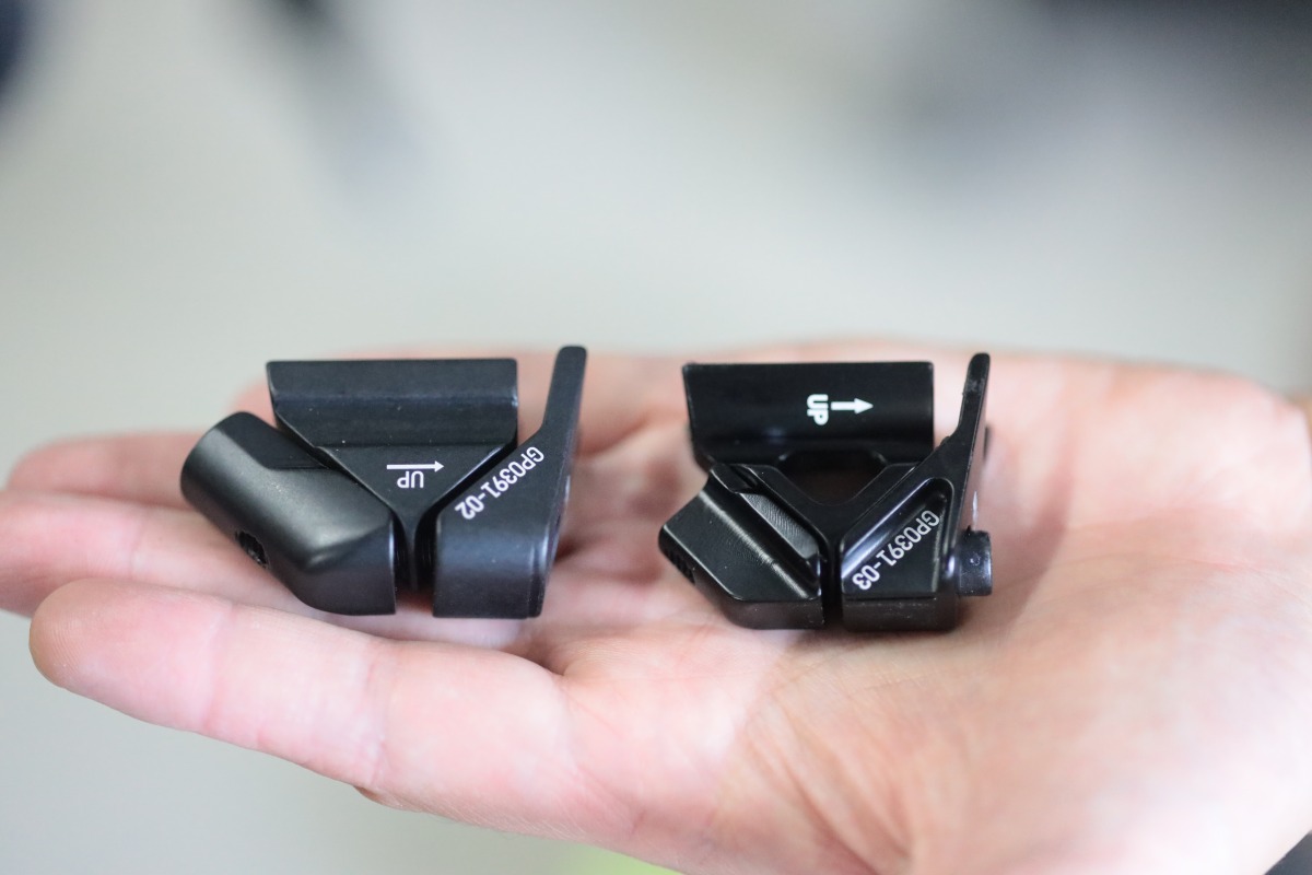 左が旧型、右が新型のシートクランプ。形状は共有だが、細かく肉抜きをして10~15gの軽量化。