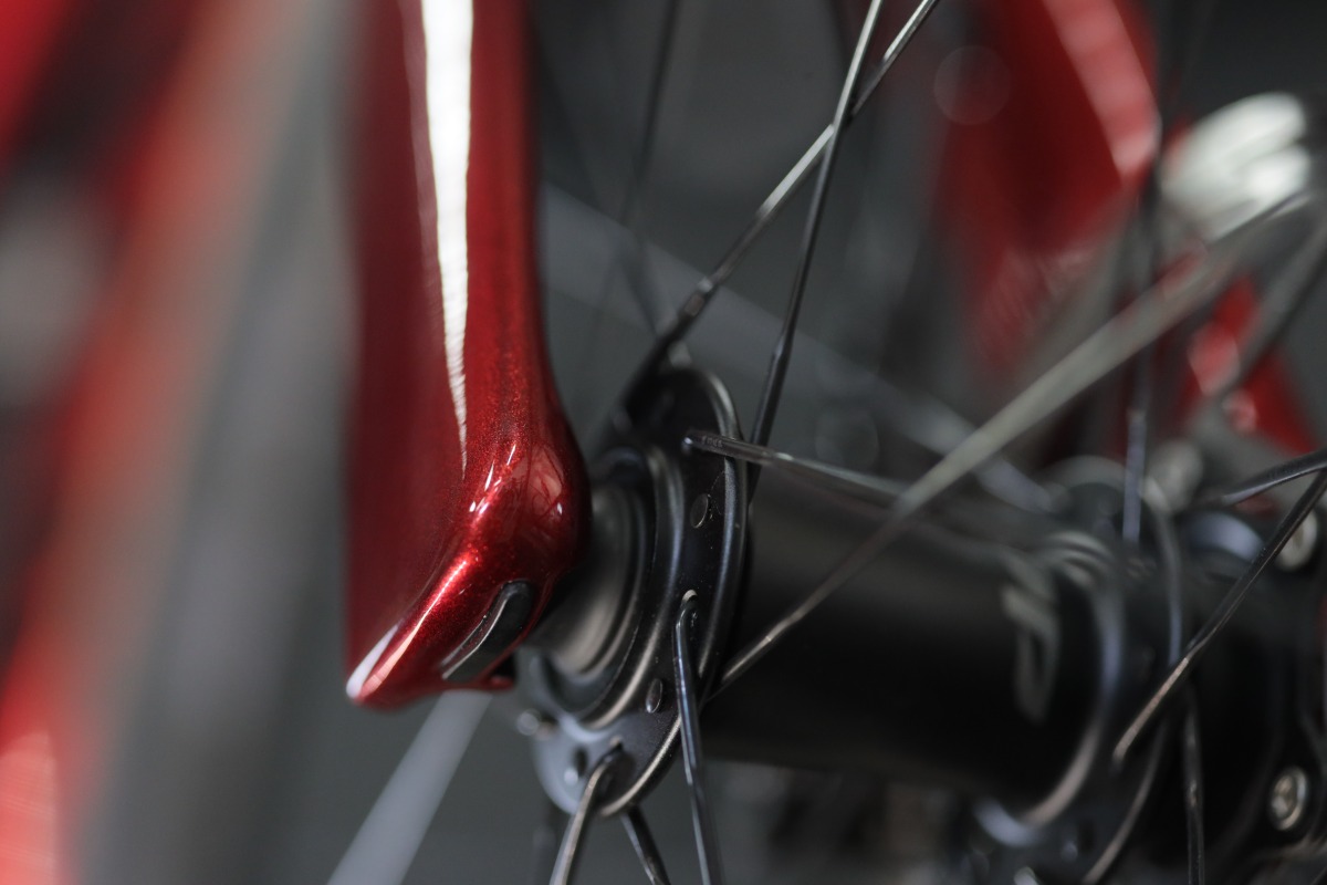 スルーアクスルのネジ山側がふさがれ、反対側もフレームと面一に。見た目がよくなると同時に空力性能向上にも寄与する。まさにチリツモ。カッコよく言えばマージナルゲイン。さらに前輪を外したとき、地面と当たって傷がつかないように、フォーク先端にゴムの保護が付く。