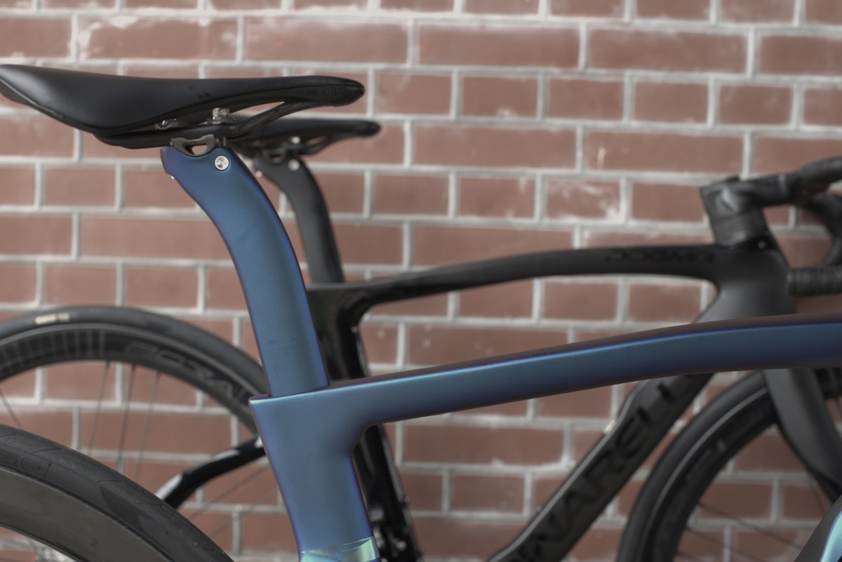 試乗車を大きな箱から出した瞬間、高級感にしばしポーっとなった。試乗車のカラーはLUXTER BLUE。青から紫へと変化する偏光性塗装はともすれば下品になってしまうものだが、本車のそれは彩度がそれほど高くなく上品だ。クリア層は凹凸の細かいセミマット。この色で艶ありにするとギラギラしすぎてしまうだろうし、マットが強すぎるとフレーム形状の輪郭がぼやけてしまうだろう。色味にしろマット具合にしろ、入念に吟味されたものだと思う。
