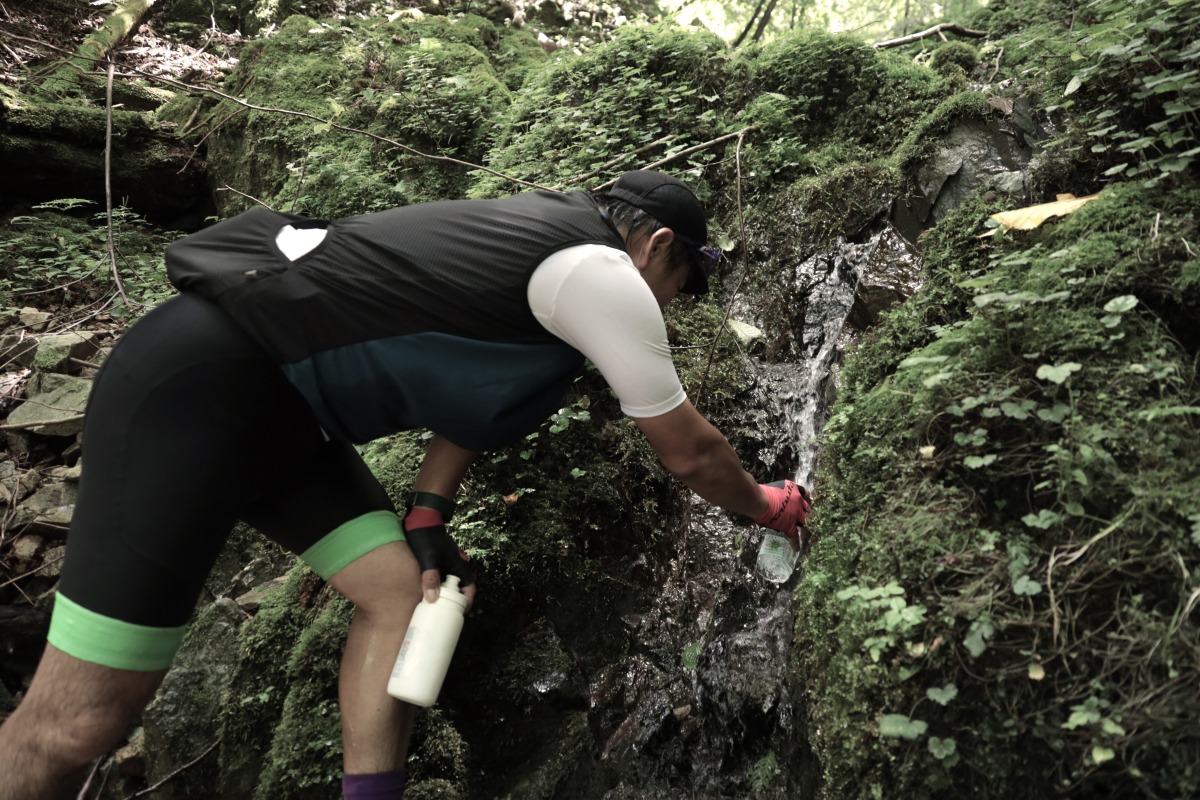 「コースがきついのか、35℃に達する暑さがきついのか、はたまた走っている自分の体力がないからか?」とにかくキツく、ベテラン参加者からも「あそこは足つきますよね」というセリフしか聞こえてこなかった。途中、坂がきついところではバイクを押し、さらに湧き水を見かけるごとに頭から水浴びをしながら、上りっぱなしの1時間となった。