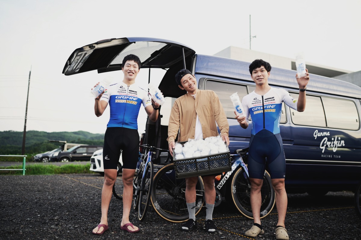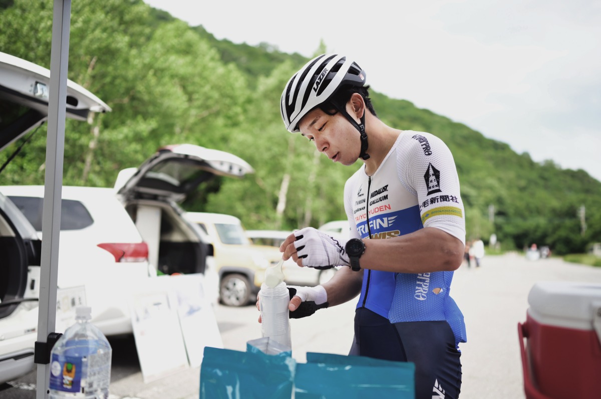 金子選手はボトルの中に水と共に栄養を摂取できるようドリンクをつくっていた。本イベントのエイドではACTIVIKEからグランフォンドウォーターの提供もあり、参加者は自由に摂取することが可能だ。