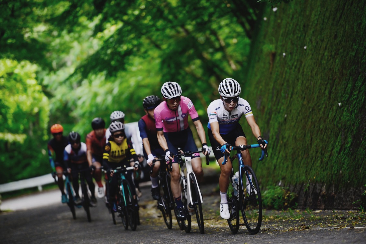 群馬グリフィン・小山選手が先頭で集団を引っ張る。「いつもいるチームではクライムの時に自分の気持ちいいペースで走ると周りを置いて行ってしまうことも多い。このイベントの参加者はみんなヒルクライマーといえるので、頑張って走ってもみんなと一緒に集団で走れるのでとても楽しい」と話す参加者もいたように、赤城山山頂付近でも集団はあった。