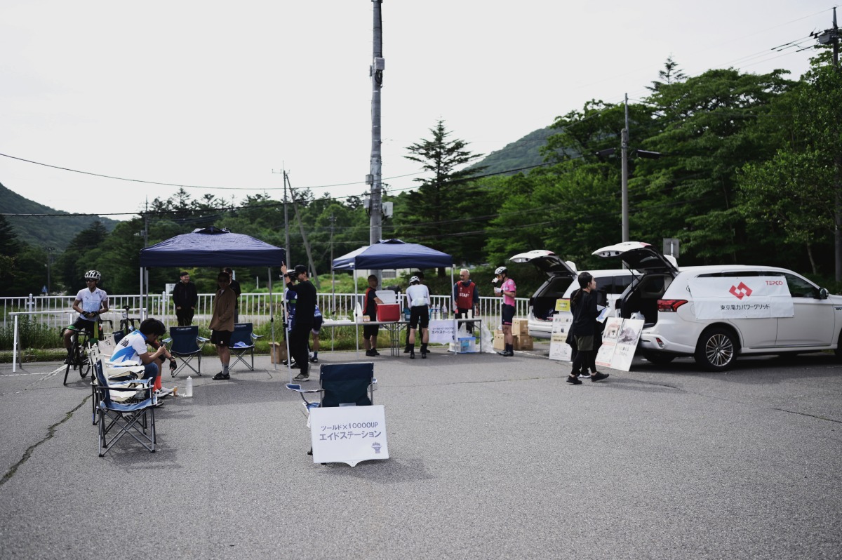 赤城山を上りきった湖の近くにはエイドポイントを設置。この時点で約55kmを走行し、本日の約1/4を消化。なお、エイドステーションの運営は東京電力パワーグリッド高崎支社が協力をしている。詳細は下段にも記載しているが、電気自動車をつかってスマホの充電設備を整えたり冷蔵庫も稼働させたりと、積極的な姿勢でイベントに協力している姿勢が印象的だ。