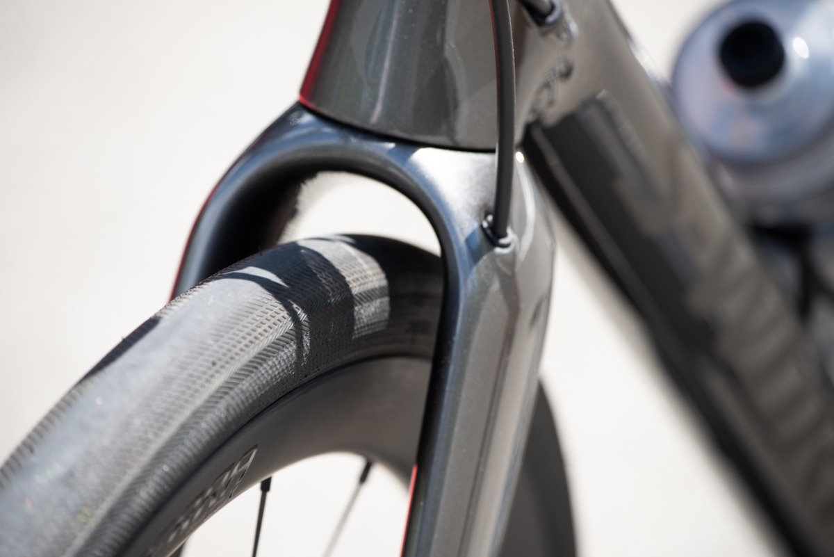 「ルーベSL8は32Cを前提に設計しています。どのサイズのタイヤをスペックインするか、上限と下限をどこにするかをエンジニアと相談しながら決めました。入れようと思えばもっと細いタイヤも入りますが、24Cや26Cを入れるとハンドリングが意図した特性からずれてしまいますし、ペダルが路面と当たりやすくなるというデメリットもあります」